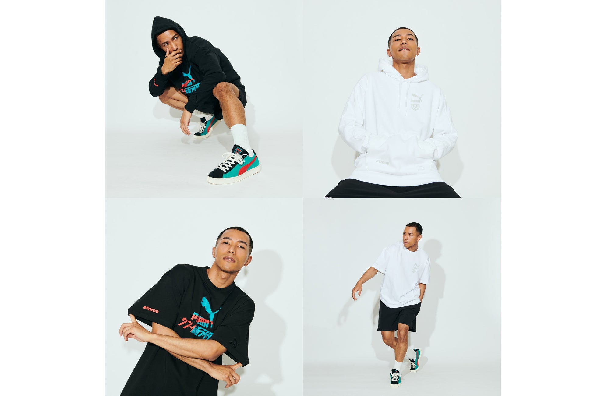 WHITEのS/S TEEとHOODIEは胸にPUMA LOGOとバッタオーグのエンブレムをグレイカラーでプリント。こちらも袖には「atmos」LOGOを配置しています。