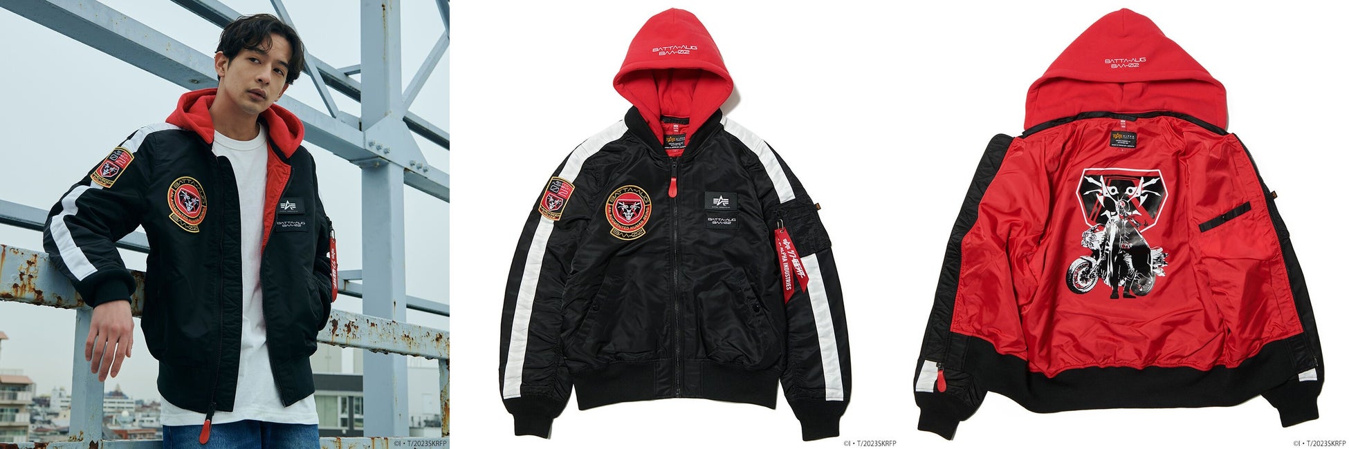 劇中スーツからインスパイアされた、本体色ブラックに内側がレッドのカラーリング。フロント部分、右袖のエンブレムパッチが『シン・仮面ライダー』の世界観を演出。内側背面には、仮面ライダー第2号とサイクロン号をプリント。また、左胸の面ファスナー”ALPHA INDUSTRIES”レザーワッペンを取り外すと「H.ICHIMONJI」の文字が現れる仕様となっています。
