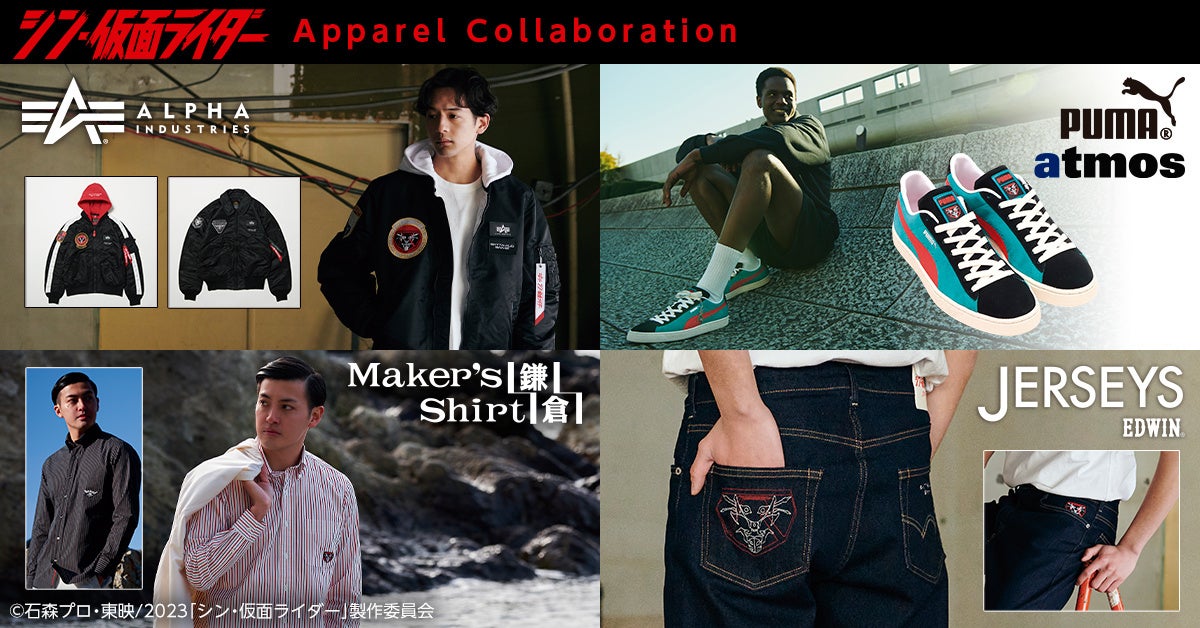 『シン・仮面ライダー』をオマージュし、人気のPUMA SUEDEをグリーンベースで表現したPUMAスニーカー(16,500円 税込/送料・手数料別途)のほか、 ALPHAフライトジャケットシリーズ、EDWIN JERSEYS、鎌倉シャツなどファン待望のラインナップでお届け!2023年3月16日(木)12時に通常販売を開始します。(企画:株式会社バンダイ)