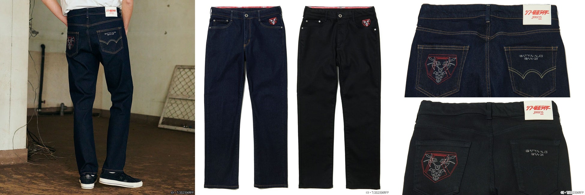 『シン・仮面ライダー』レギュラーストレートモデルは、ストンとまっすぐ落ちるルーズなシルエットながら、裾幅を少し細く設定することで野暮ったくならないすっきりストレート、ロールアップでも楽しめるような少し長めのレングス設定。左ヒップポケットにライダーのマークをステッチ、右ヒップポケットポケットにBATTA-AUGのエンブレムを刺繍。フロント左ポケットにライダーマークのワッペンをアクセントに、ホワイトのロゴパッチを施したスペシャル仕様となっています。