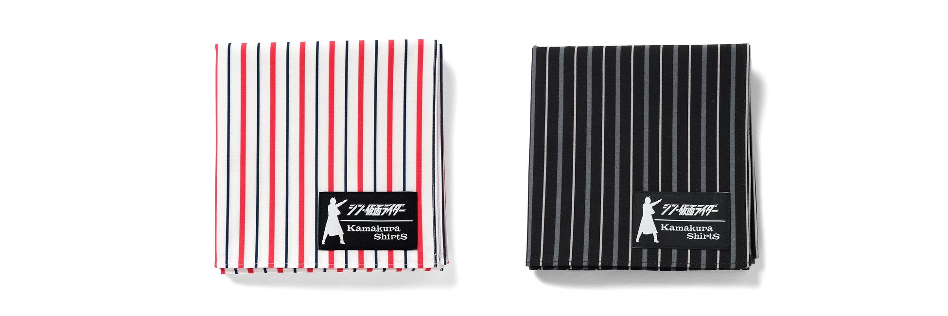 仮面ライダー柄、SHOCKER柄の別注生地にてハンカチも作成します。