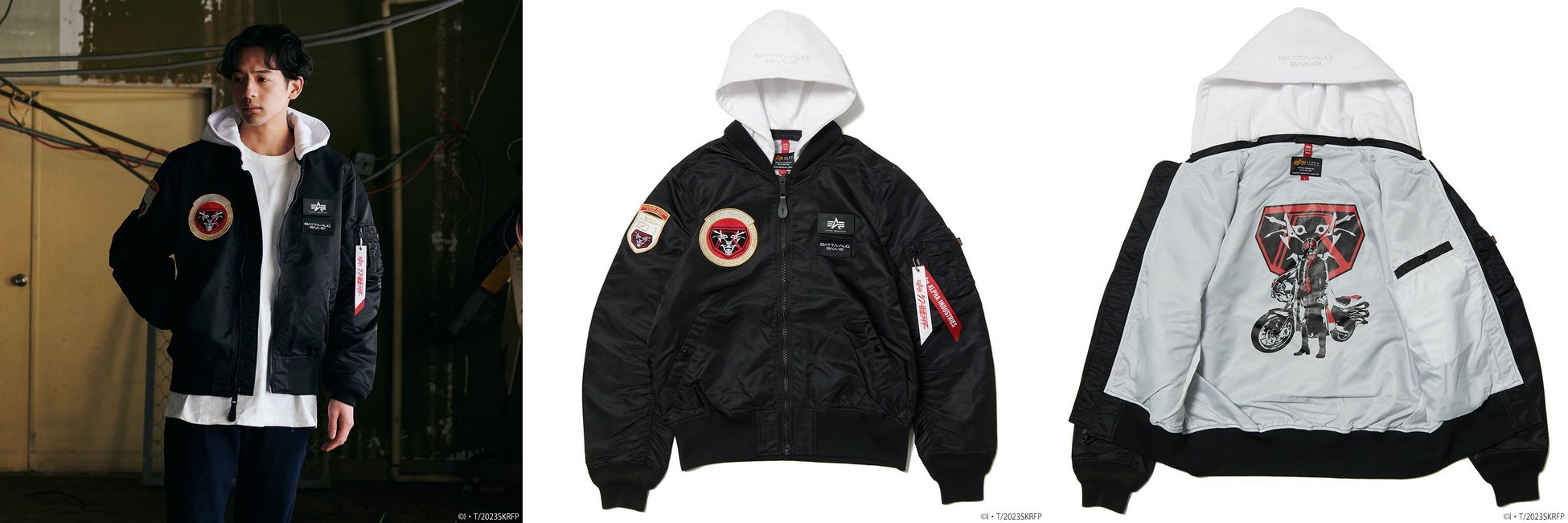 劇中スーツからインスパイアされた、本体色ブラックに内側がホワイトのカラーリング。フロント部分、右袖のエンブレムパッチが『シン・仮面ライダー』の世界観を演出。内側背面には、仮面ライダーとサイクロン号をプリント。また、左胸の面ファスナー”ALPHA INDUSTRIES”レザーワッペンを取り外すと「T.HONGO」の文字が現れる仕様となっています。