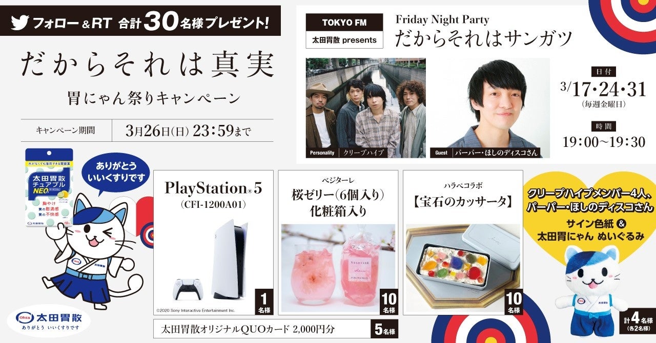 株式会社太田胃散(本社:東京都文京区/代表取締役社長:太田淳之)は、『だからそれは真実胃にゃん祭りキャンペーン』として、クリープハイプ、パーパー・ほしのディスコさんの「サイン色紙&太田胃にゃんぬいぐるみ」や「PlayStation®5 (CFI-1200A01)」、「ベジターレ 桜ゼリー(6個入り)」、「ハラペコラボ【宝石のカッサータ】」、「太田胃散オリジナルQUOカード2,000円分」が合計30名に当たるキャンペーンを2023年3月17日(金)10:00~3月26日(日)23:59の期間で実施します。