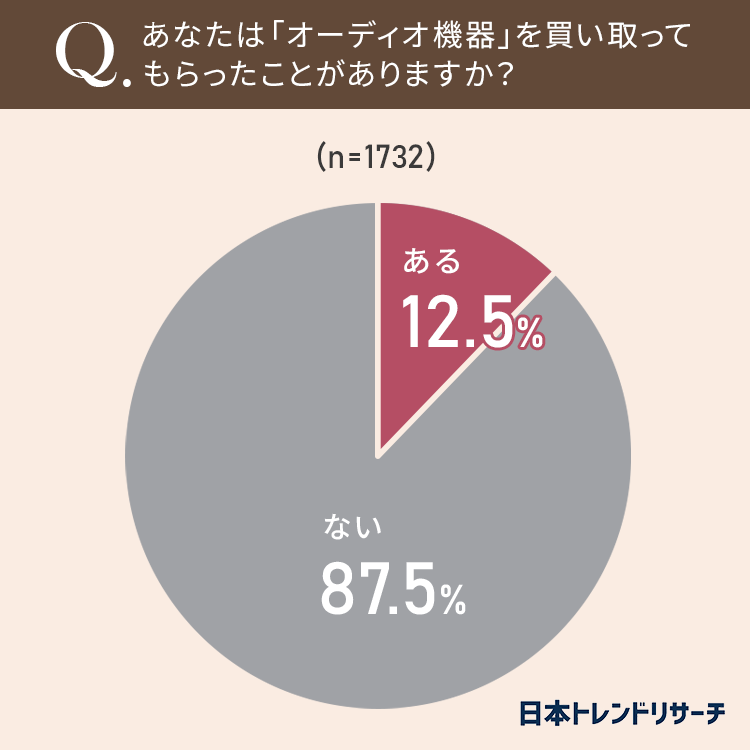 全国の男女1732人のうち、12.5%がオーディオ機器の売却経験が「ある」という結果になりました。