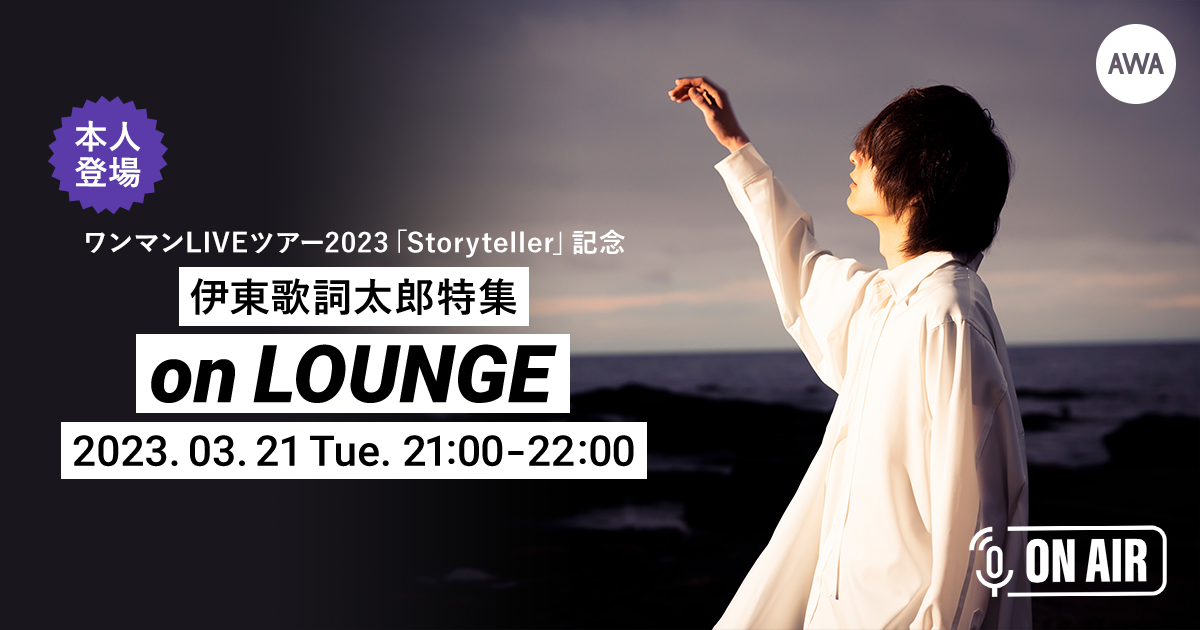 今回のイベントは、現在開催中のワンマンLIVEツアー2023『Storyteller』を記念して開催されるもので、新曲はもちろん、これまでの楽曲も一挙オンエアいたします。ラウンジは、どなたでも参加することができ、AWAアプリを事前にダウンロードしていれば、リクエストやアーティストとの交流など、よりお楽しみいただけます。ぜひ、伊東歌詞太郎の本人登場ラウンジをお楽しみください。