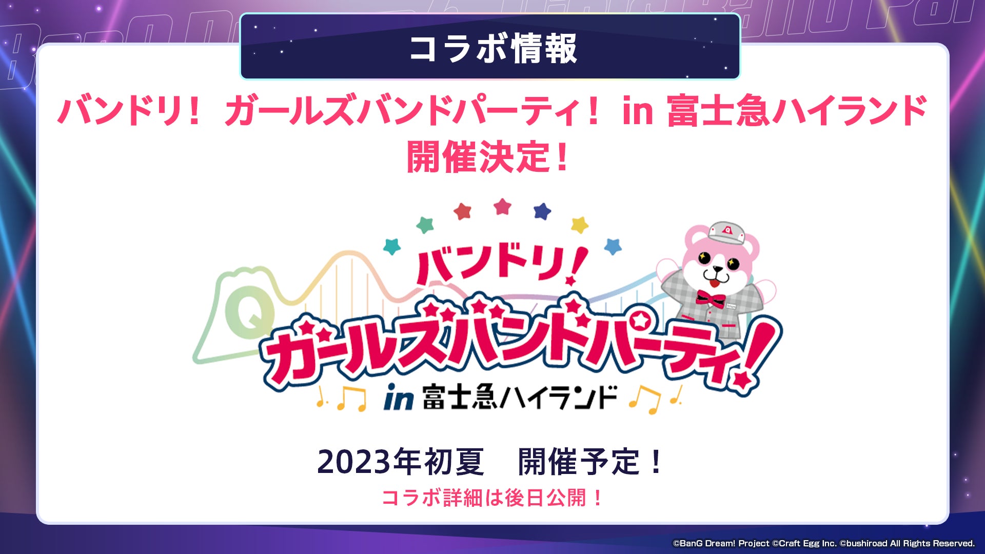 2023年初夏に「バンドリ! ガールズバンドパーティ! in 富士急ハイランド」の開催が決定いたしました。詳細につきましては、続報をお待ちください。