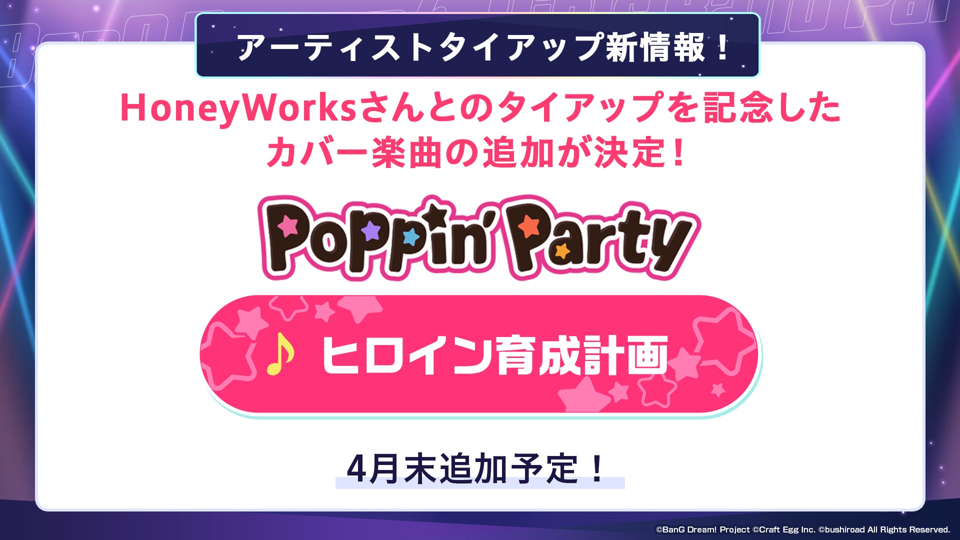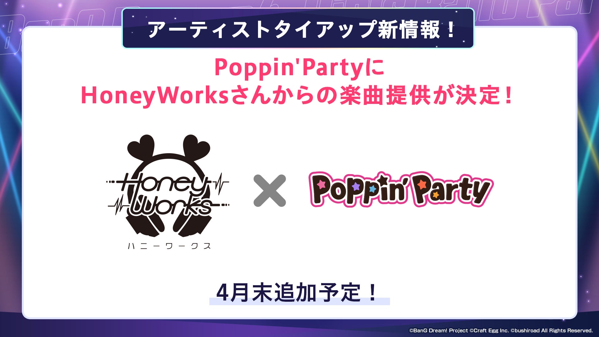 アーティストタイアップとして、Poppin’PartyにHoneyWorksさんより楽曲の提供が決定いたしました。実施は2023年4月末を予定しております。