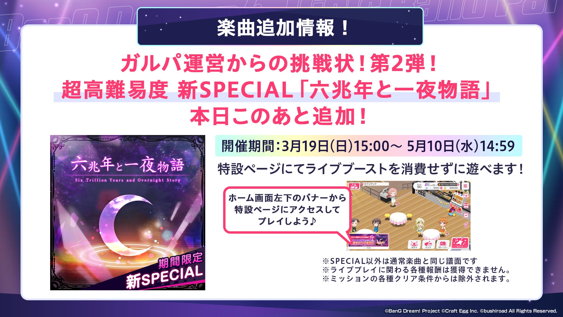 2023年3月19日(日)15時より、ガルパ運営からの挑戦状の第2弾として、期間限定で超高難易度の新SPECIAL『六兆年と一夜物語』が登場いたしました。ゲーム内のホームバナーより遷移できる特設ページにて、ライブブーストを消費することなくプレイすることができます。