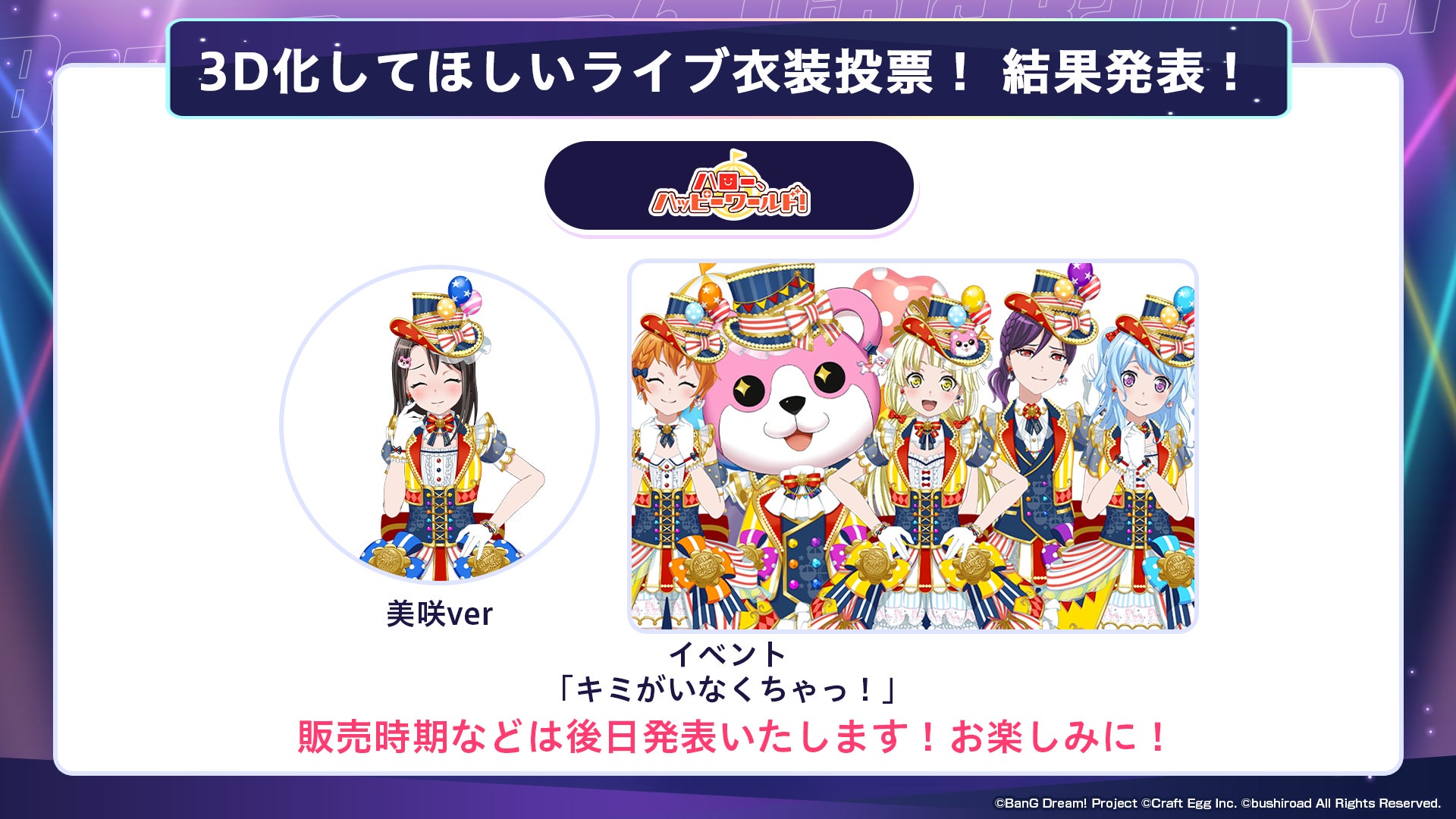 スマートフォンアプリの企画開発事業を展開する株式会社Craft Egg(本社:東京都渋谷区 代表取締役:森川 修一、以下、Craft Egg)と、株式会社ブシロード(本社:東京都中野区 代表取締役社長:木谷 高明、以下、ブシロード)の共同制作によるスマートフォン向けゲーム「バンドリ! ガールズバンドパーティ!」(以下、ガルパ)は、2023年3月19日(日)の「ガルパ特番 新情報発表ステージ!」にて、Poppin’PartyにHoneyWorksさんからの楽曲提供が決定したことや、「ホロライブ」所属タレントとのエクストラ楽曲の続報を発表いたしました。また、「3D化してほしいライブ衣装投票!」の投票結果のほか、「富士急ハイランド」とのコラボレーション企画などについて発表いたしました。