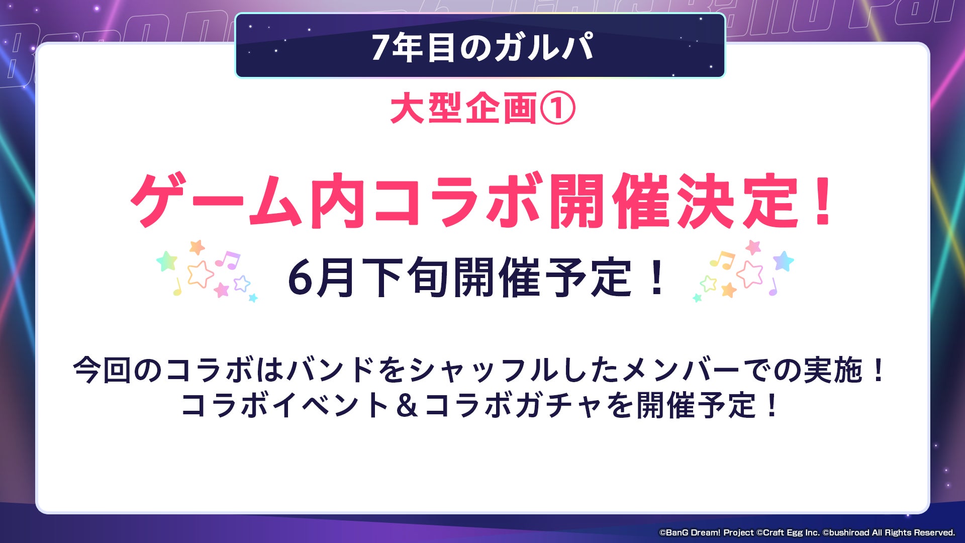 2023年6月下旬にゲーム内コラボを開催することが決定いたしました。本コラボはバンドをシャッフルしたメンバーで実施を予定しており、コラボイベントとコラボガチャを開催いたします。詳細につきましては、続報をお待ちください。