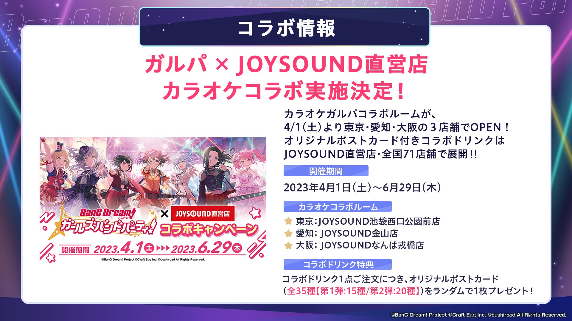 2023年4月1日(土)より、「バンドリ! ガールズバンドパーティ!×JOYSOUND直営店コラボキャンペーン」の実施が決定いたしました。東京・愛知・大阪の3店舗でカラオケコラボルームをオープンするほか、JOYSOUND直営店71店舗にて、オリジナルポストカード付きのコラボドリンクを展開いたします。詳細につきましては、キャンペーンサイトをご確認ください。