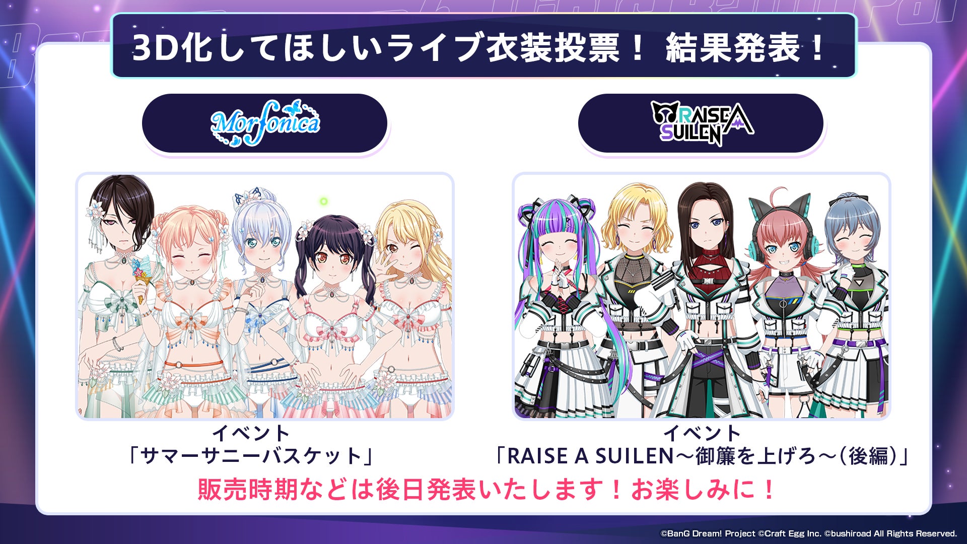 2023年1月9日(月)より実施しておりました「みんなで選ぶ!3D化してほしいライブ衣装投票!~ショップで販売する過去衣装を決めよう!〜」の結果を発表いたしました。各バンドで3D化する衣装は下記になります。