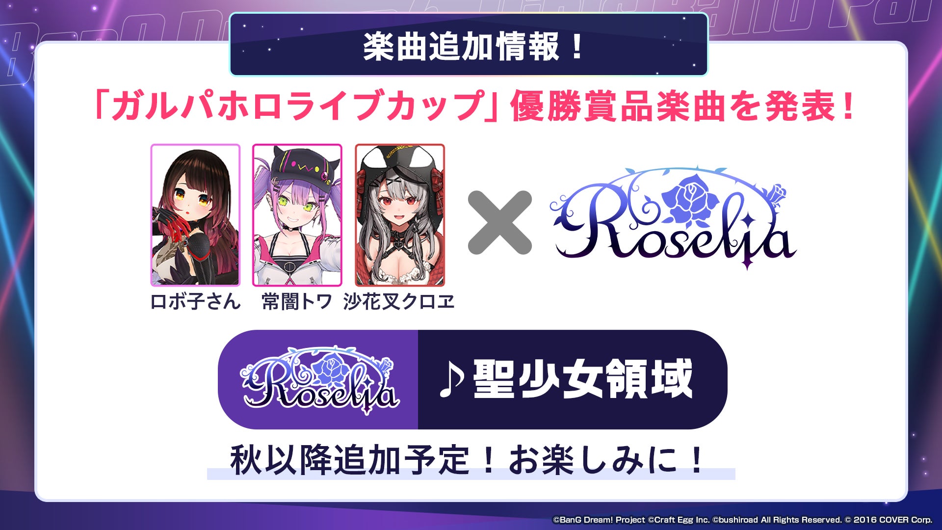 2022年8月28日(日)に配信された「ガルパホロライブカップ in ホロライブサマー」にて、ロボ子さん、常闇トワさん、沙花叉クロヱさんによる「チームハッピー」が優勝し、優勝賞品の「好きなガルパのバンドと歌える権利」としてRoseliaとのカバー楽曲制作が決定いたしました。2023年秋以降に「チームハッピー」とRoseliaが歌う『聖少女領域』を追加いたします。