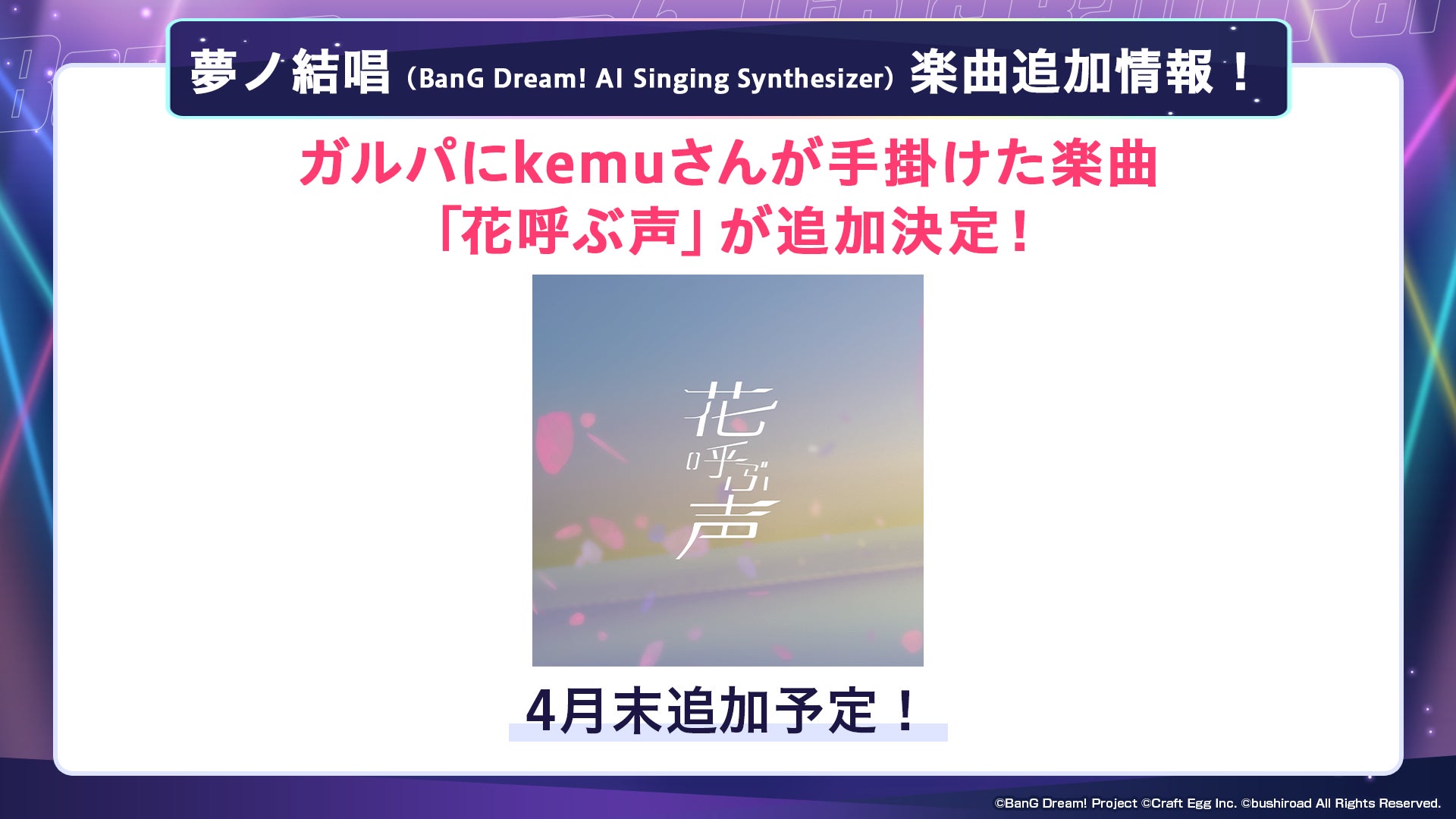 kemuさんが手掛けた夢ノ結唱楽曲『花呼ぶ声』を追加することが決定いたしました。2023年4月末に追加予定です。詳細につきましては、続報をお待ちください。