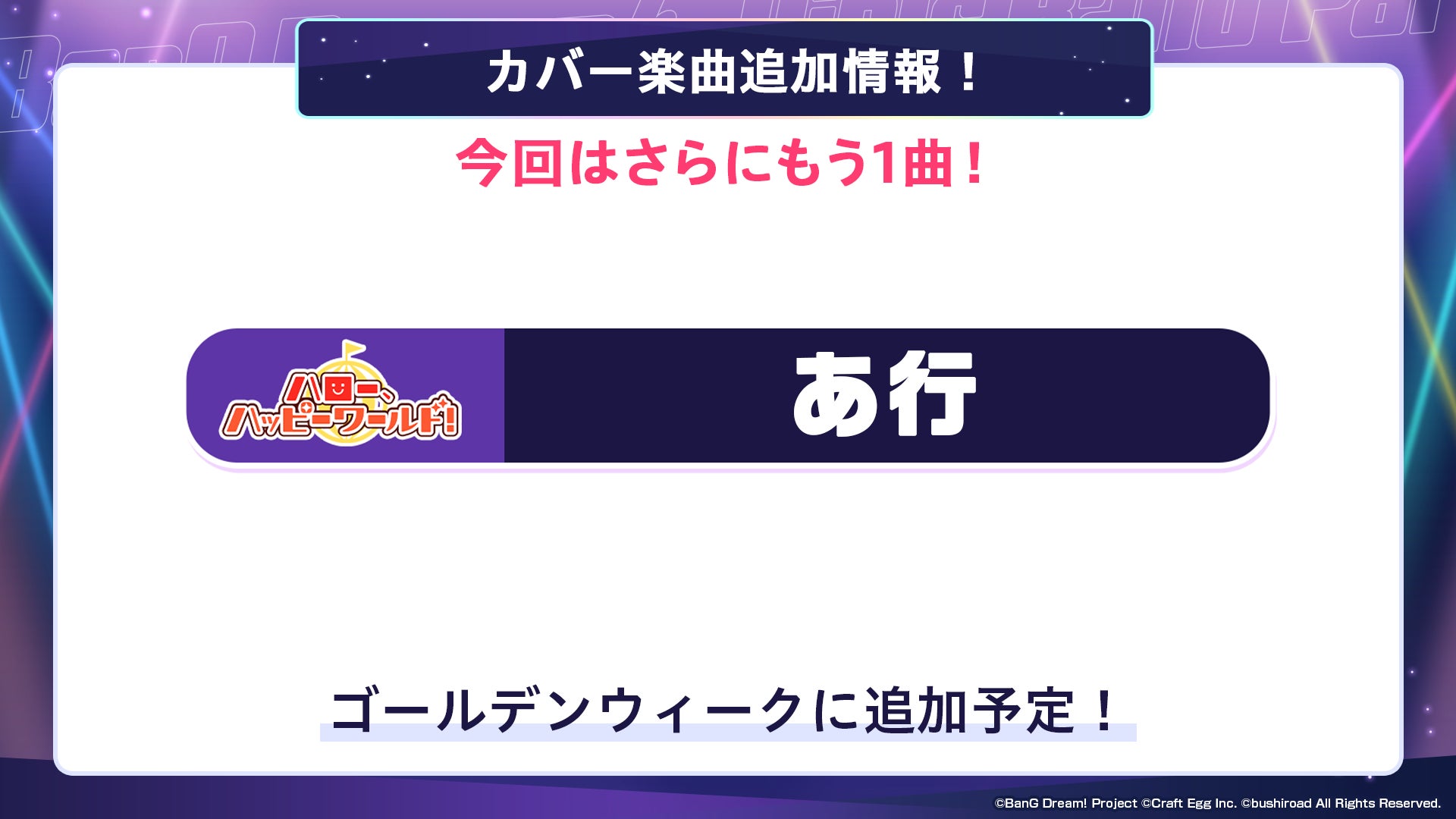 放送内にて、ゴールデンウィークに追加予定のカバー楽曲のヒントを公開いたしました。詳細につきましては、続報をお待ちください。