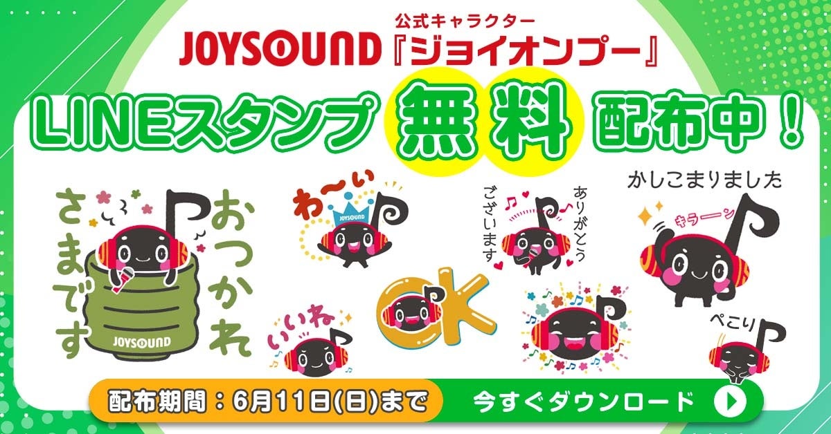 LINEスタンプは、3月20日(月)から6月11日(日)までの期間中、LINE公式アカウントの友だち追加なども不要で、どなたでも無料でダウンロードいただけます。(利用期間はダウンロードから180日間)挨拶から感情表現まで、友だちやご家族とはもちろん、ビジネスでも使いやすいLINEスタンプ、全8種をご用意。なお、JOYSOUNDの公式Twitterアカウント(@JOYSOUND_PR)では、このたびのLINEスタンプ完成を記念して、無料配布期間中に、Amazonギフトカードなどが総勢30名様に当たるリツイートキャンペーンも開催中です。この機会をお見逃しなく、LINEスタンプを手に入れて、「ジョイオンプー」と一緒にトークをお楽しみください!