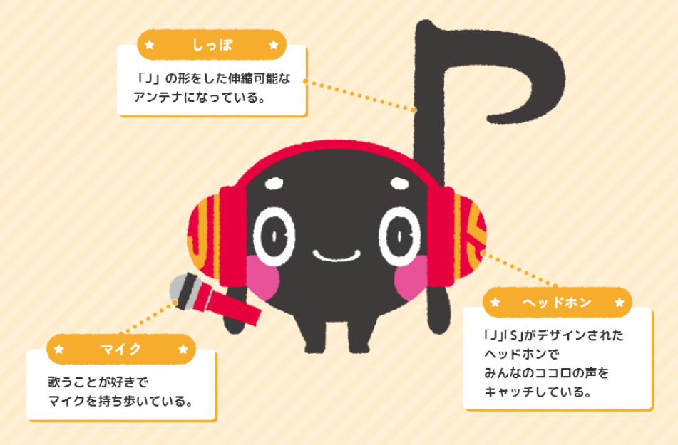 未知の生物でありながら、音の化身であるような、不思議な存在。しっぽをアンテナがわりにヘッドホンでみんなのココロの声をしっかりキャッチ!みんなに寄り添いながら一緒になって歌ったり、踊ったり、時には勇気づけてくれる優しい子。