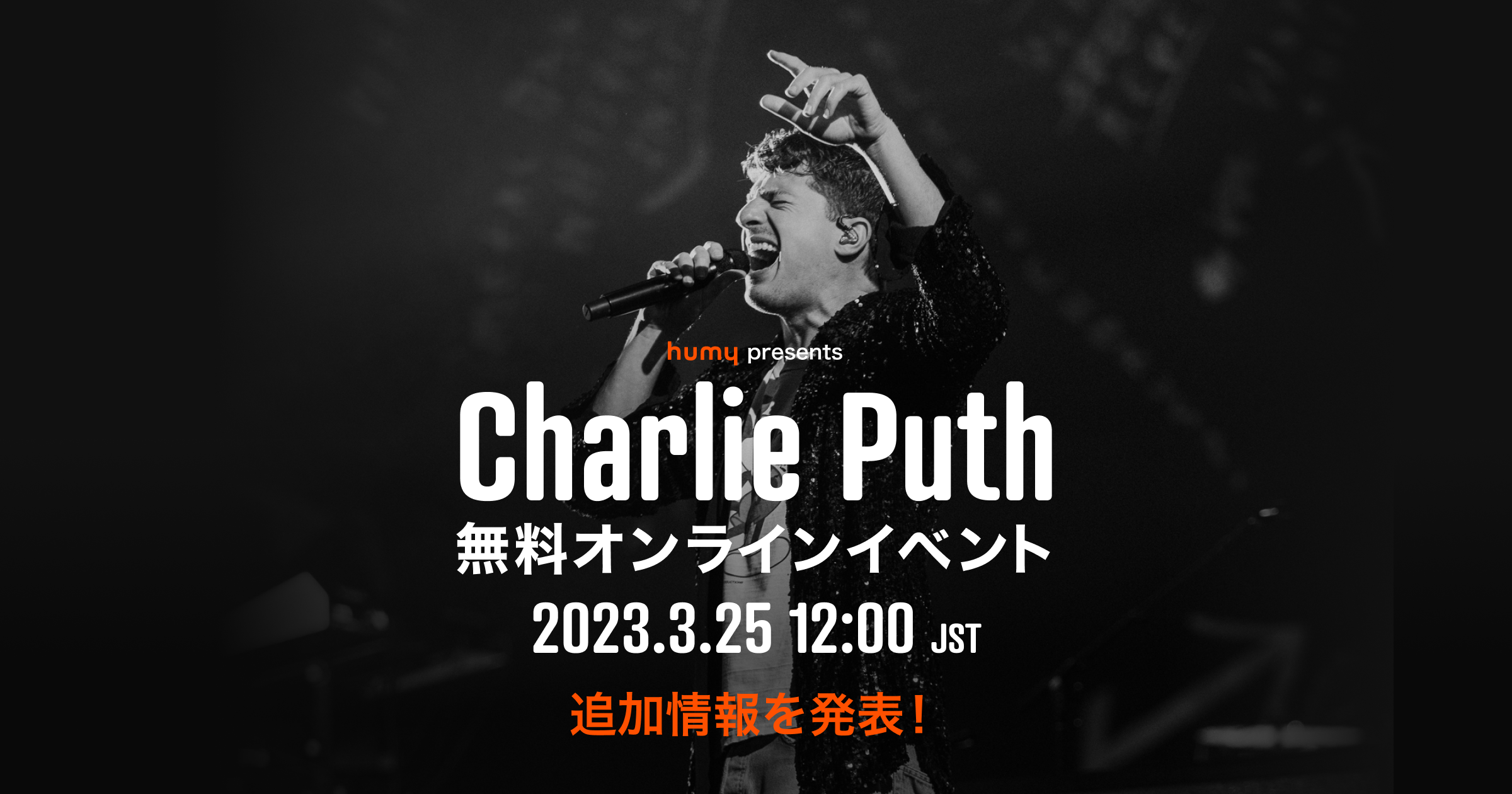 株式会社MIXI(東京都渋谷区、代表取締役社長:木村 弘毅)は、3月25日(土)にチャーリー・プースの公式ファンコミュニケーションプラットフォーム「humy」にて開催する無料オンラインイベント「humy presents: the Charlie Puth Livestream Experience (available in select territories)」の追加情報をお知らせします。