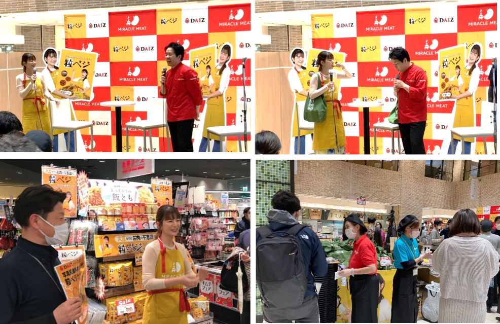 今回の販売イベントでは、食料品専門店・北野エース都内3店舗(渋谷 東急フードショー店、東武池袋店、東京スカイツリータウン・ソラマチ店)にDAIZアンバサダーのタレント・スザンヌさんが登場。2022年12月より販売を開始した大豆ミート商品『粒べジ』の入った「特別粒べジセット」を購入いただいたお客様との写真撮影&サイン会を各店にて実施しました。