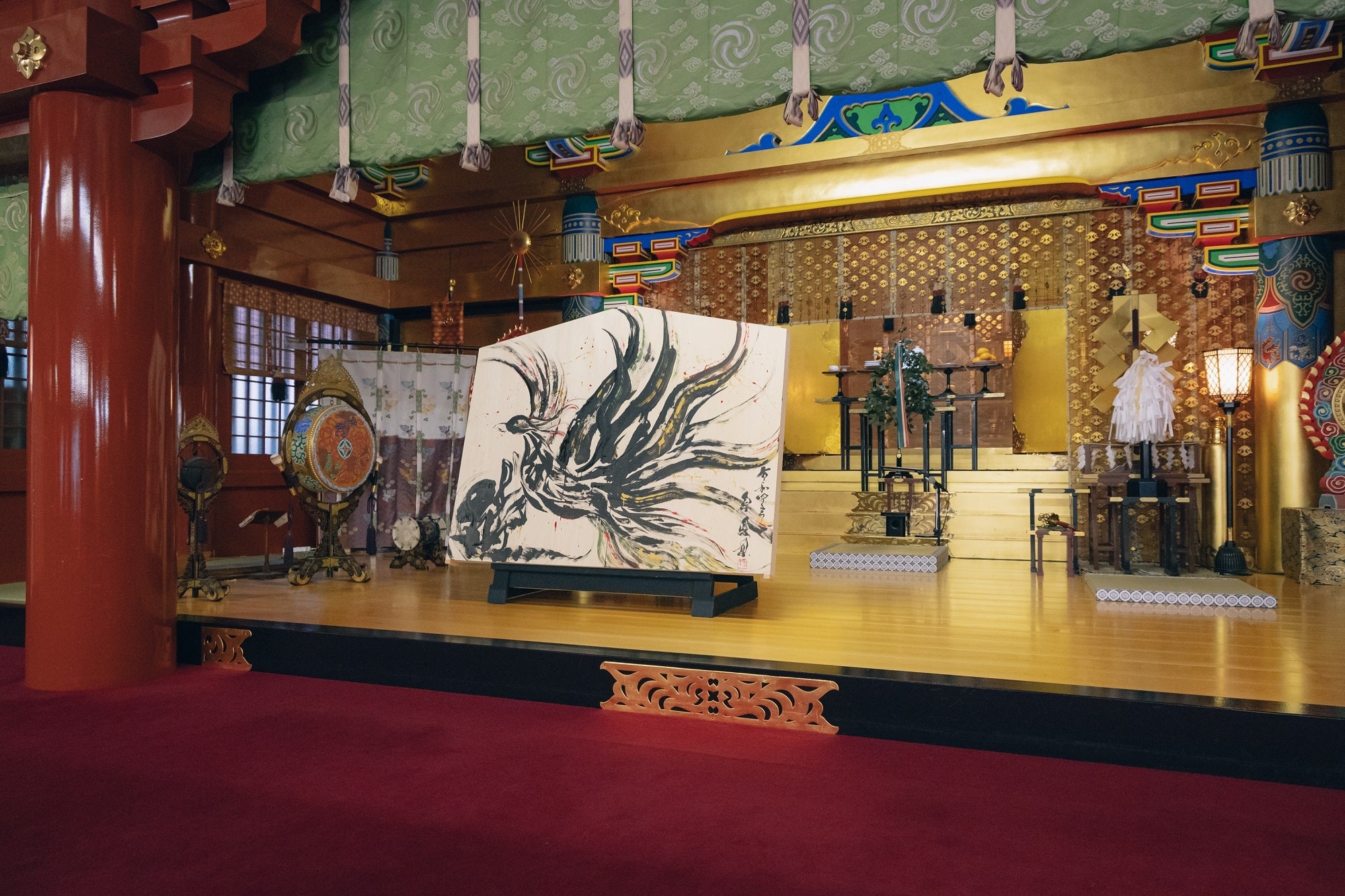 ライブパフォーマンスのあとは、完成した作品を奉納する「奉納式」を社殿にて実施。今回の個展の成功、そして原のさらなる活躍を願い、お祓いをしていただきました。