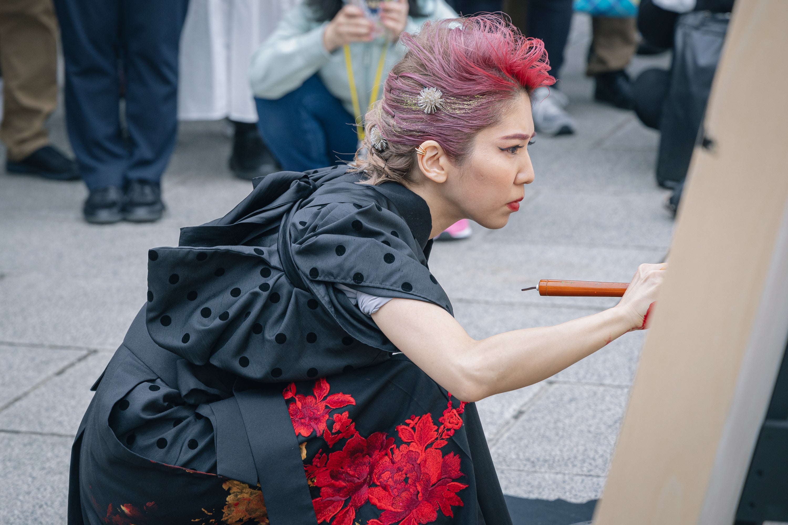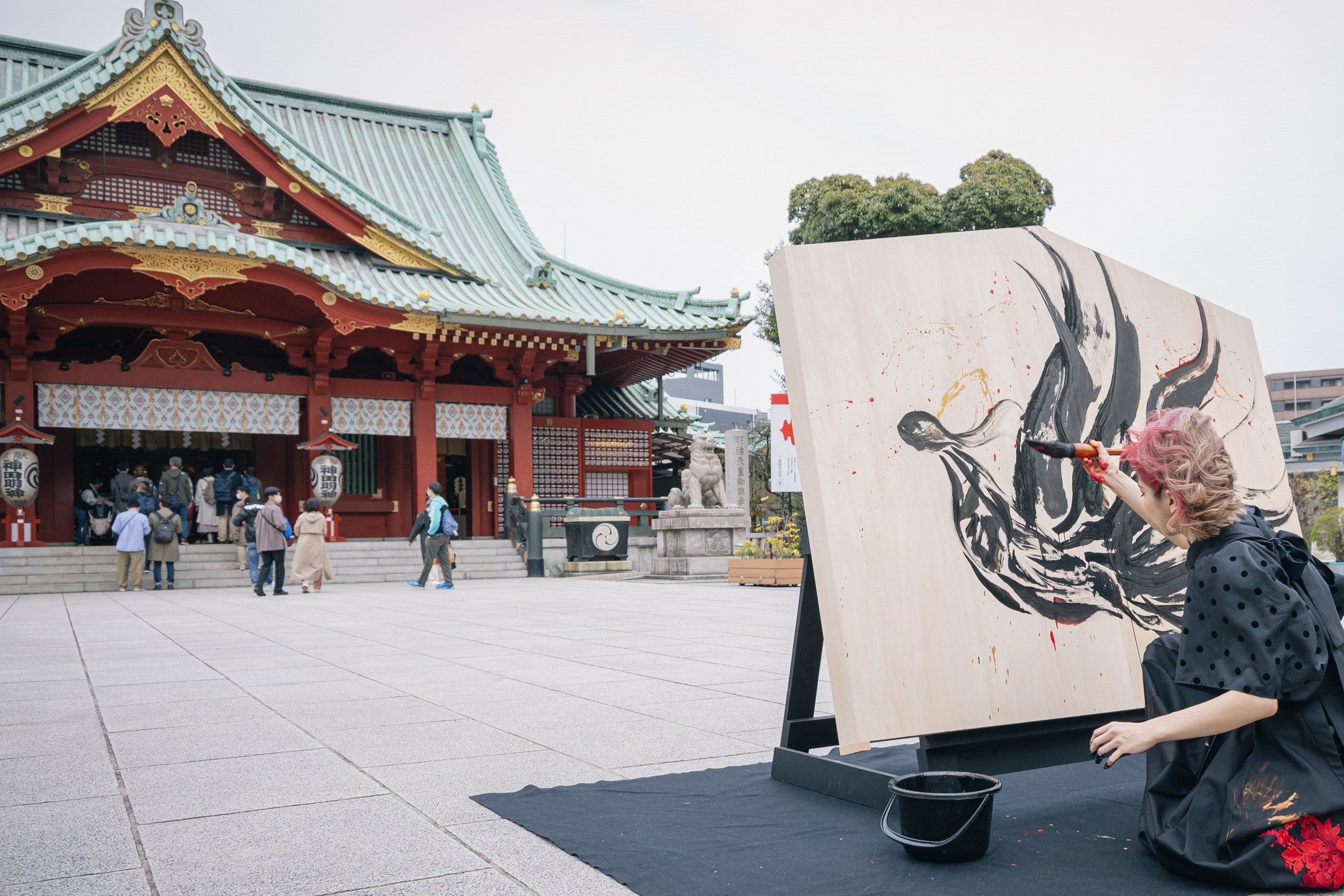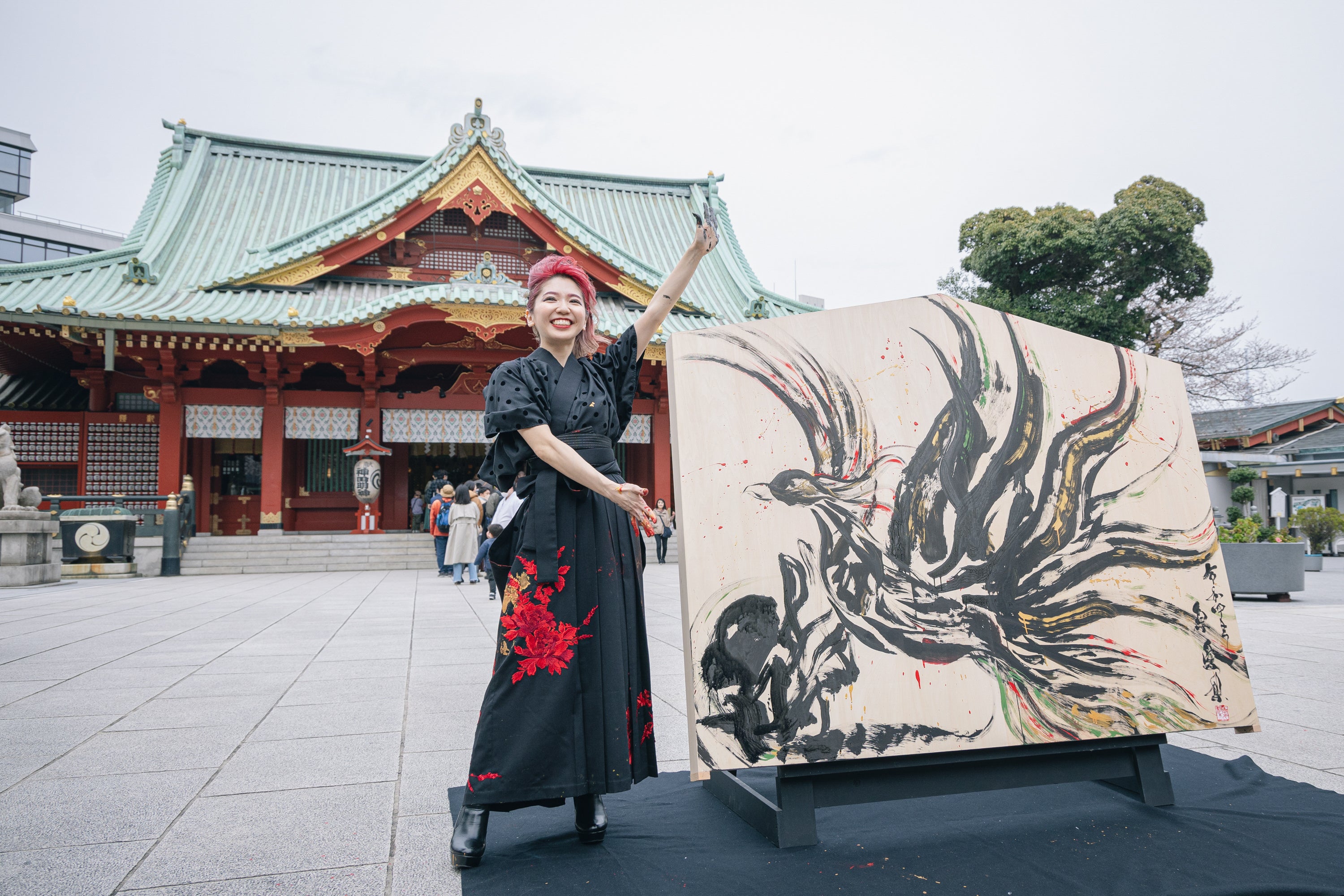 開催を祝して、特別に神田明神境内にてライブパフォーマンスも実施。大勢の観客に囲まれながら、140cm×180cmの巨大な絵馬に、4つの文字(幸・求・与・感)からなる鳳凰をダイナミックに書く、圧巻のパフォーマンスを披露しました。『「礎」 書道アーティスト 原愛梨展』は、4月23日(日)まで開催いたします。