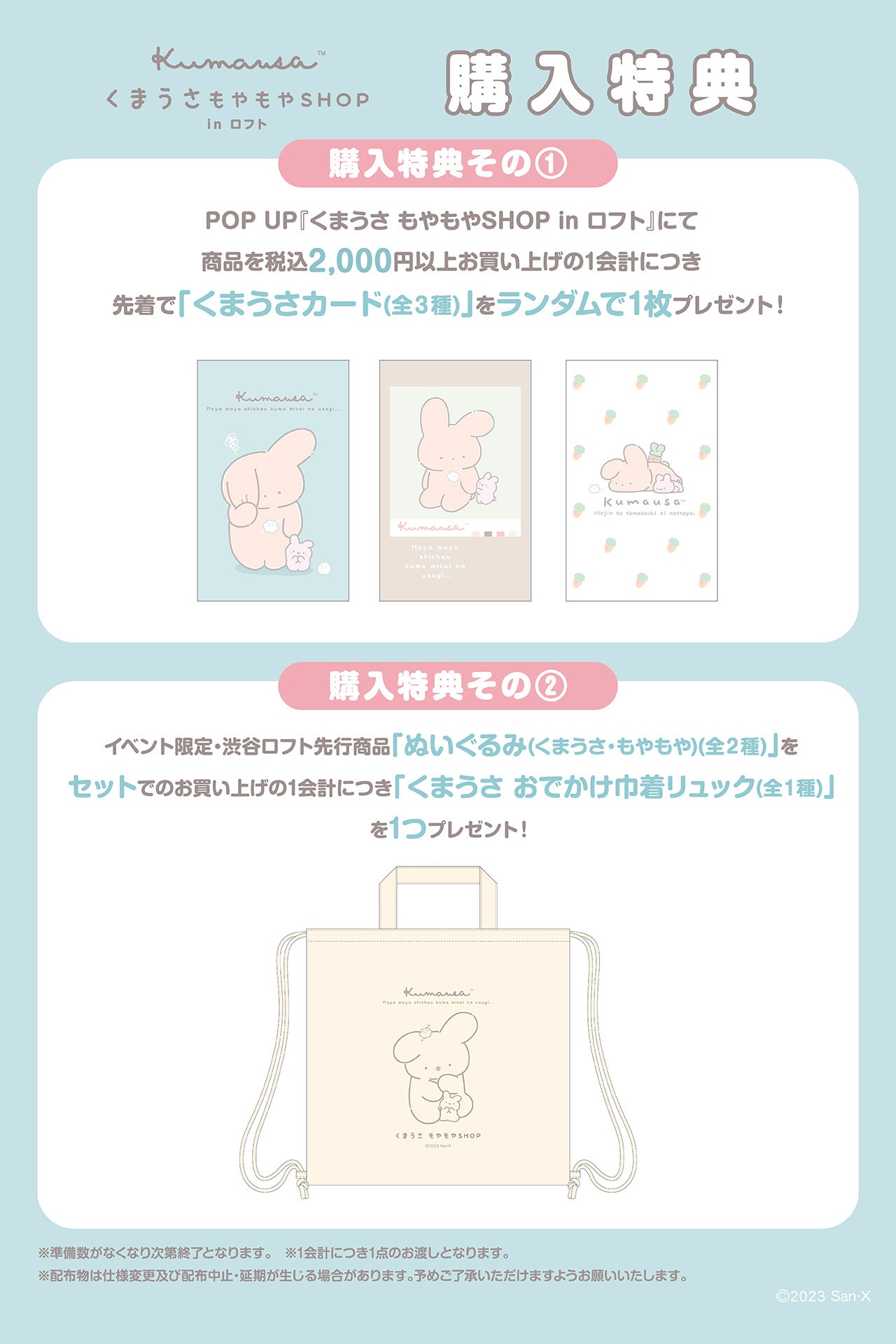 渋谷ロフト先行のイベント限定「ぬいぐるみ(くまうさ/もやもや全2種)」をセットお買い上げの 1 会計につき、先着で「くまうさ おでかけ巾着リュック(全1種)」を1点プレゼント!