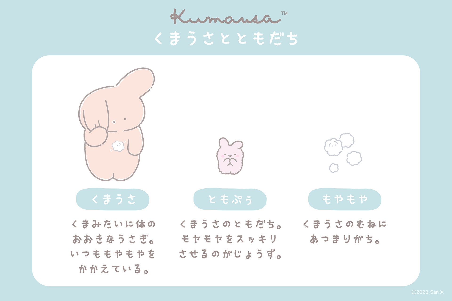 「くまうさ」は、いつも胸に「もやもや」を抱えるくまみたいに体のおおきなうさぎ。 もやもやがずっしりと大きくなるときもあるけれど、ともだちの「ともぷぅ」がいっしょだと不思 議と軽くなるみたい。だれにでもある心のモヤモヤにそっと寄り添うキャラクターです。
