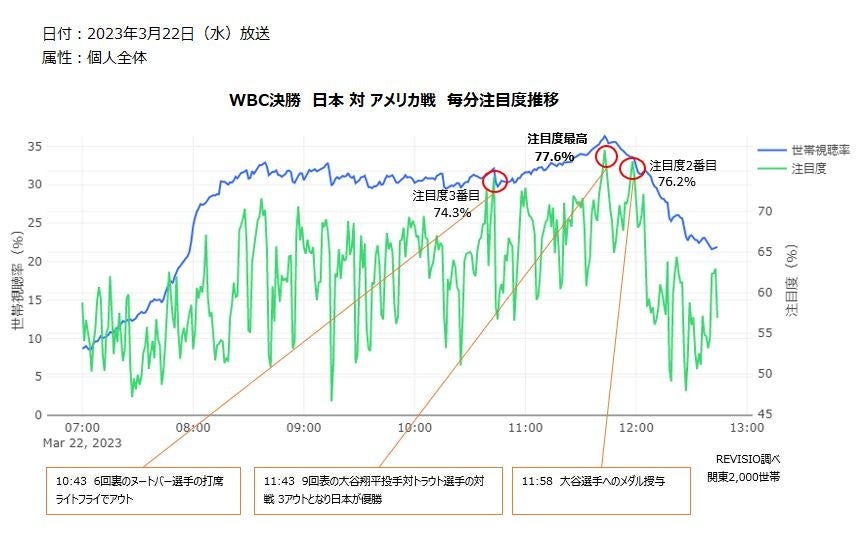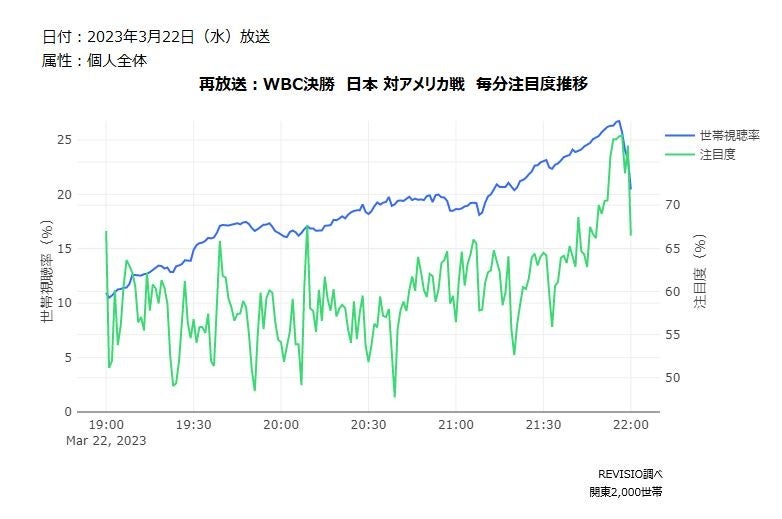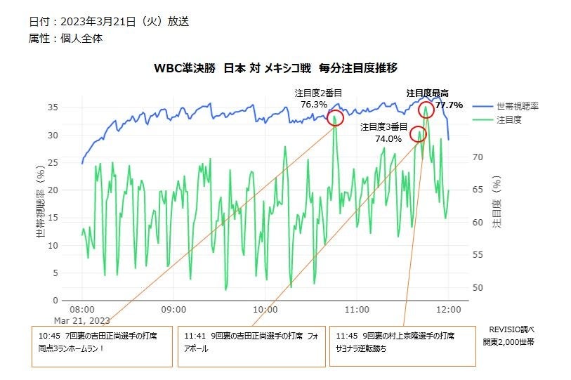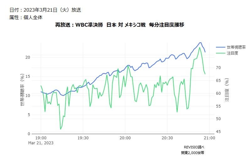 ご家庭に人体認識技術を搭載した機器を設置し、テレビスクリーンへの「注視」を測るREVISIO株式会社(旧TVISION INSIGHTS、本社:東京都千代田区、代表取締役社長 郡谷康士、以下REVISIO)は、3月21日にTBS系列で放送されたWBC準決勝「日本 対 メキシコ」と、3月22日にテレビ朝日系列で放送されたWBC決勝「日本 対 アメリカ」について、どのシーンが一番視られていたのか毎分の注目度データを使って、分析致しました。(注目度が高いとは、テレビの前の視聴者がくぎづけになったことを表します)