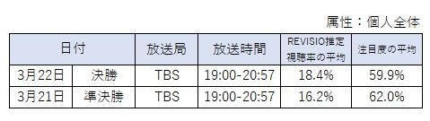 決勝、準決勝が行われた日の19時より、急遽TBS系列で試合の再放送が放送されました。当日に再放送が流れるのは異例な事ですが、朝の時間帯で試合を観られなかった人や、もう一度感動を味わいたいという人で、REVISIO推定の視聴率、注目度共に下記のような高い視聴結果になりました。