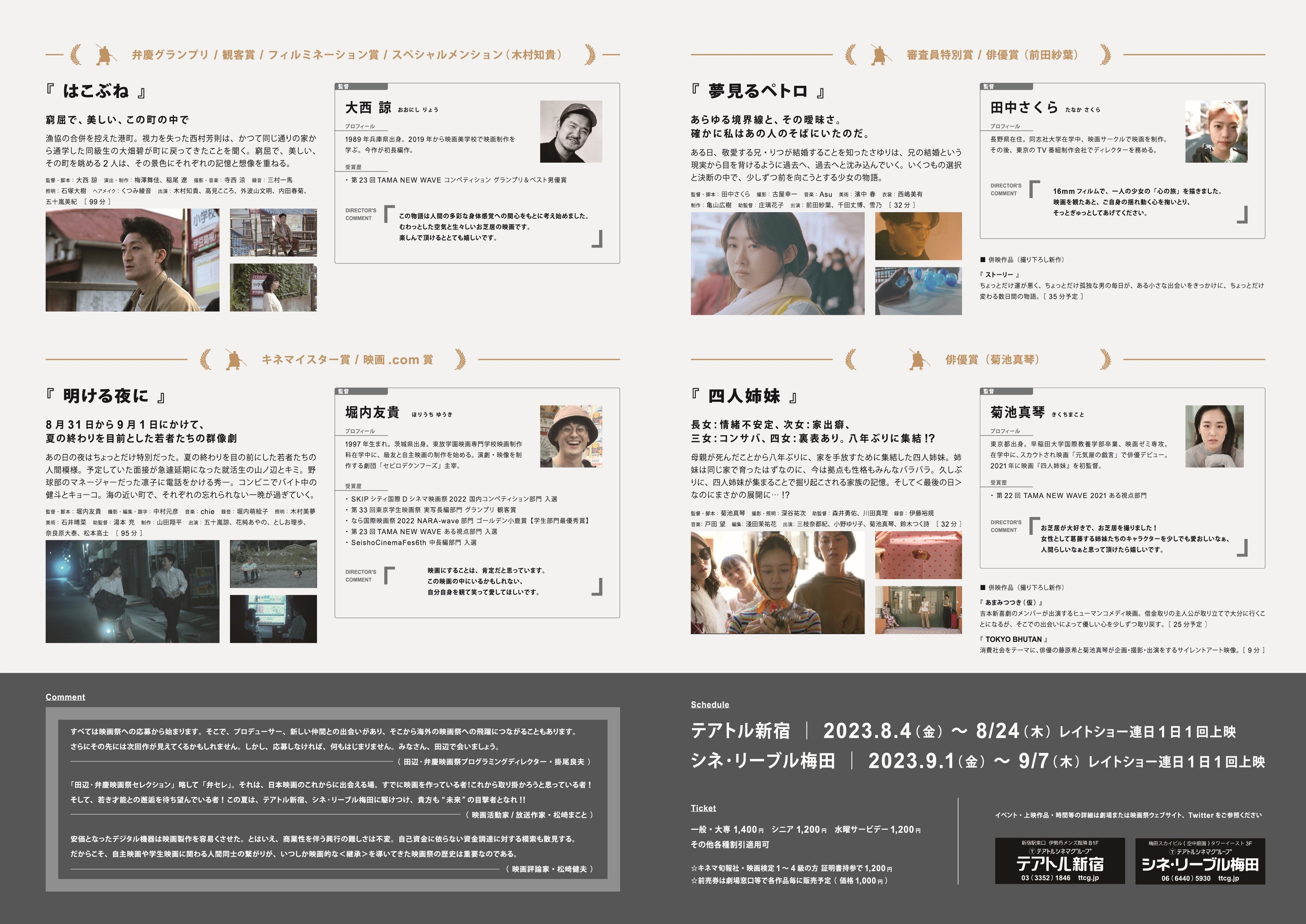 また、第16回 田辺・弁慶映画祭 コンペティション部門での受賞作品に贈られる副賞上映「田辺・弁慶映画祭セレクション2023 テアトル新宿/シネ・リーブル梅田」の開催日についても決定しましたので、併せてお知らせいたします。