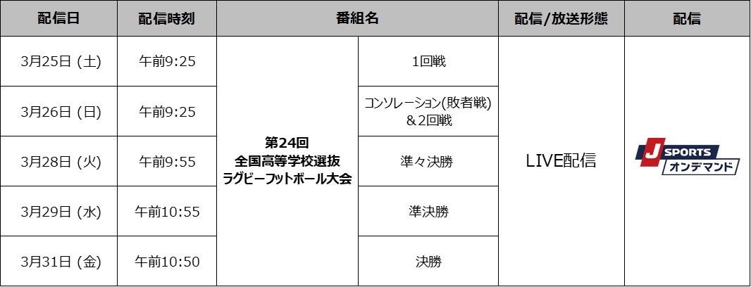 スポーツテレビ局、株式会社ジェイ・スポーツ(本社 東京都江東区、代表取締役社長 長谷 一郎、以下「J SPORTS」 ※1)は、3月25日(土)から3月31日(金)にかけて熊谷スポーツ文化公園熊谷ラグビー場で開催される「第24回全国高等学校選抜ラグビーフットボール大会」を、PC、スマホ、タブレットで見られる動画配信サービス「J SPORTSオンデマンド」 ※2 で全試合をLIVE配信いたします。