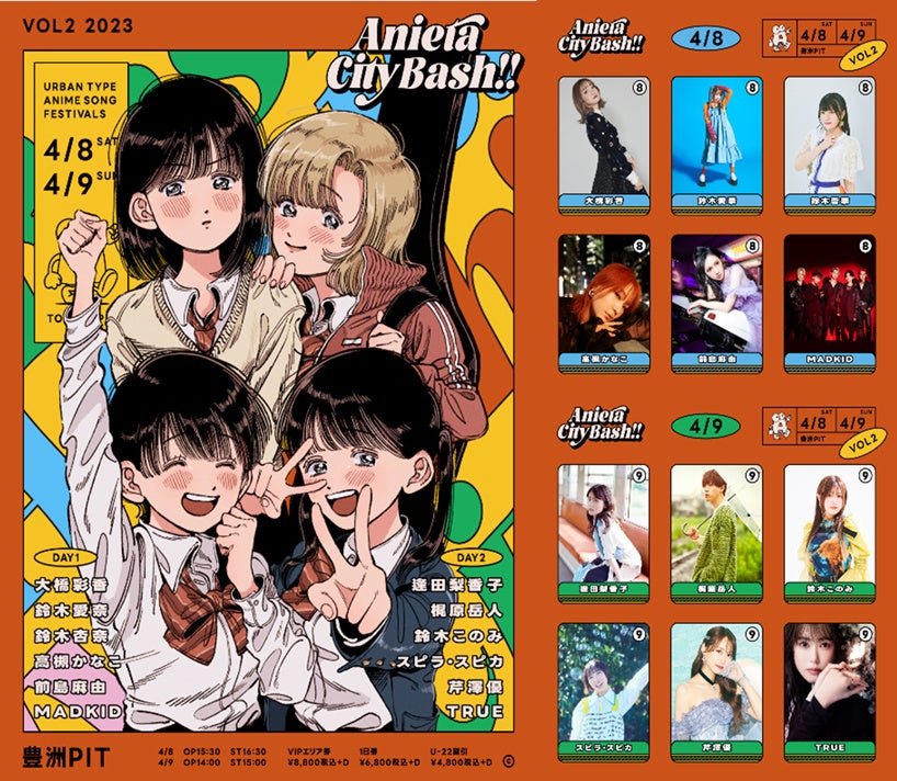 本日よりチケットぴあ、イープラスにて一般販売を開始。4月8日(土)は大橋彩香、鈴木愛奈、鈴木杏奈、高槻かなこ、前島麻由、MADKIDが出演し、4月9日(日)には逢田梨香子、梶原岳人、鈴木このみ、スピラ・スピカ、芹澤優、TRUEが出演する豪華アニソンイベントです。