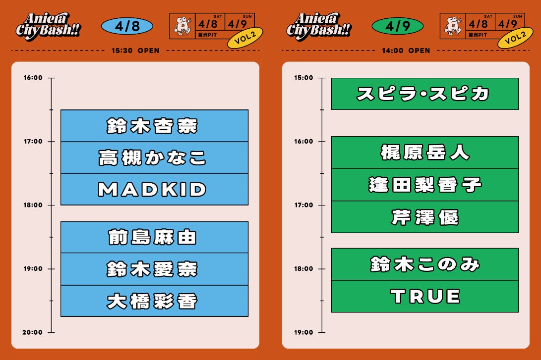 毎年9月に長野県で開催される野外アニソンフェス「ナガノアニエラフェスタ」を手掛けたスタッフ陣で送る都市型アニソンイベント「Aniera City Bash‼」が昨年の5月に開催されて以来、約1年ぶりに第二弾イベントを開催。その名も「Aniera City Bash‼vol.2」が東京豊洲PITにて4月8日(土)、4月9日(日)の2日間に渡り開催されます。