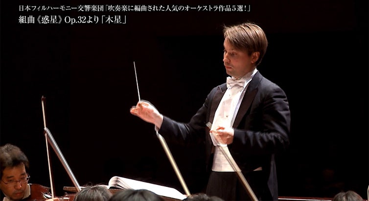 このたび配信を開始する映像には、日本フィルハーモニー交響楽団と名指揮者たちによる演奏を収録。ホルストの『組曲《惑星》より「木星」』や、ラヴェルの『《ダフニスとクロエ》第2組曲』など、吹奏楽の経験者はもちろん、誰もが一度は耳にしたことがある名曲・全5曲を、約1時間に渡る映像でたっぷりとお届けします。