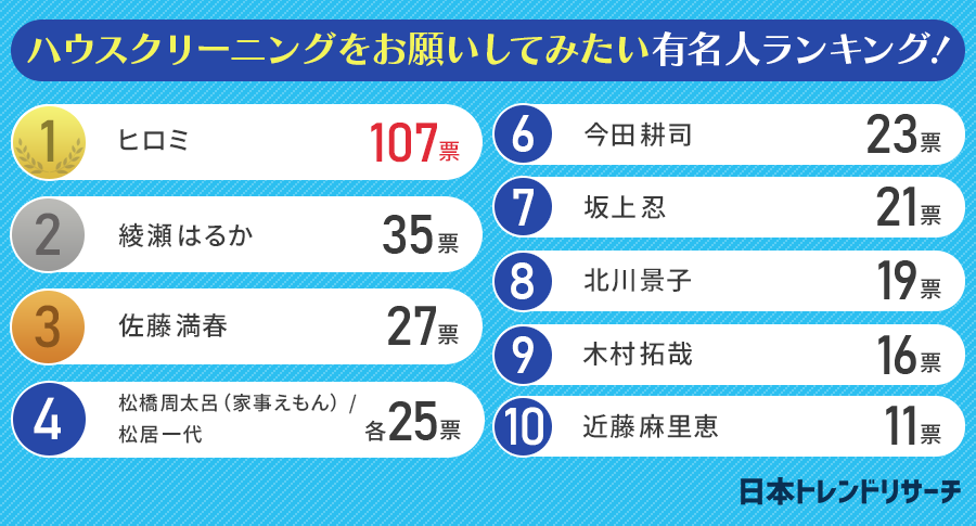 日本トレンドリサーチ(運営会社:株式会社NEXER)は、ハウスクリーニングの『ハウスコンシェルジュ』を運営する株式会社リスダンケミカルと共同で「ハウスクリーニングをお願いしてみたい有名人」に関するアンケートを実施し、結果をサイト内にて公開したので紹介します。