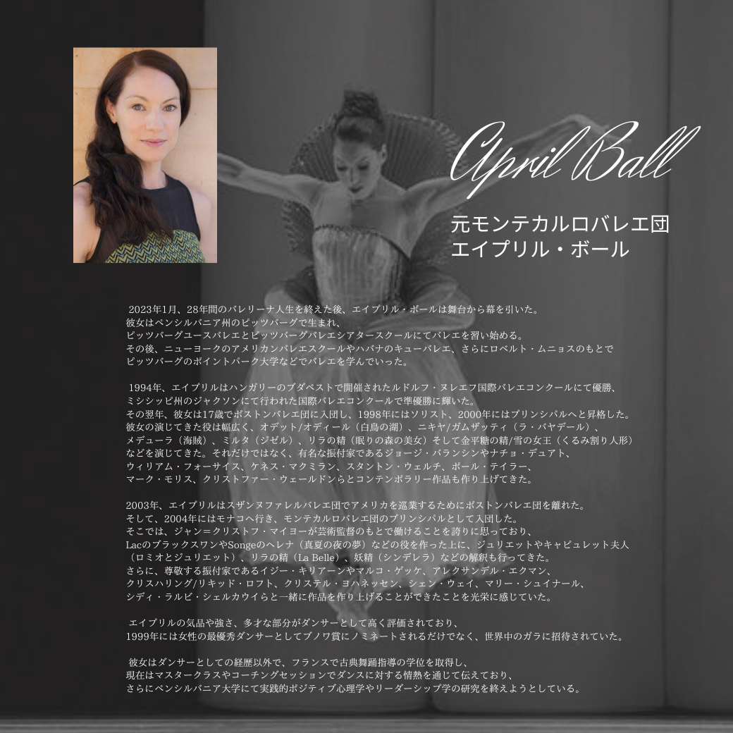 世界のトップバレリーナとして活躍し続けたエイプリル・ボール氏は、2023年1月、28年間のバレリーナ人生に幕を閉じました。現在はバレエの世界に携わるのはもちろん、心理学の研究など、多彩に活躍されているエイプリル・ボール氏のワークショップを東京・三田で受けてみませんか?