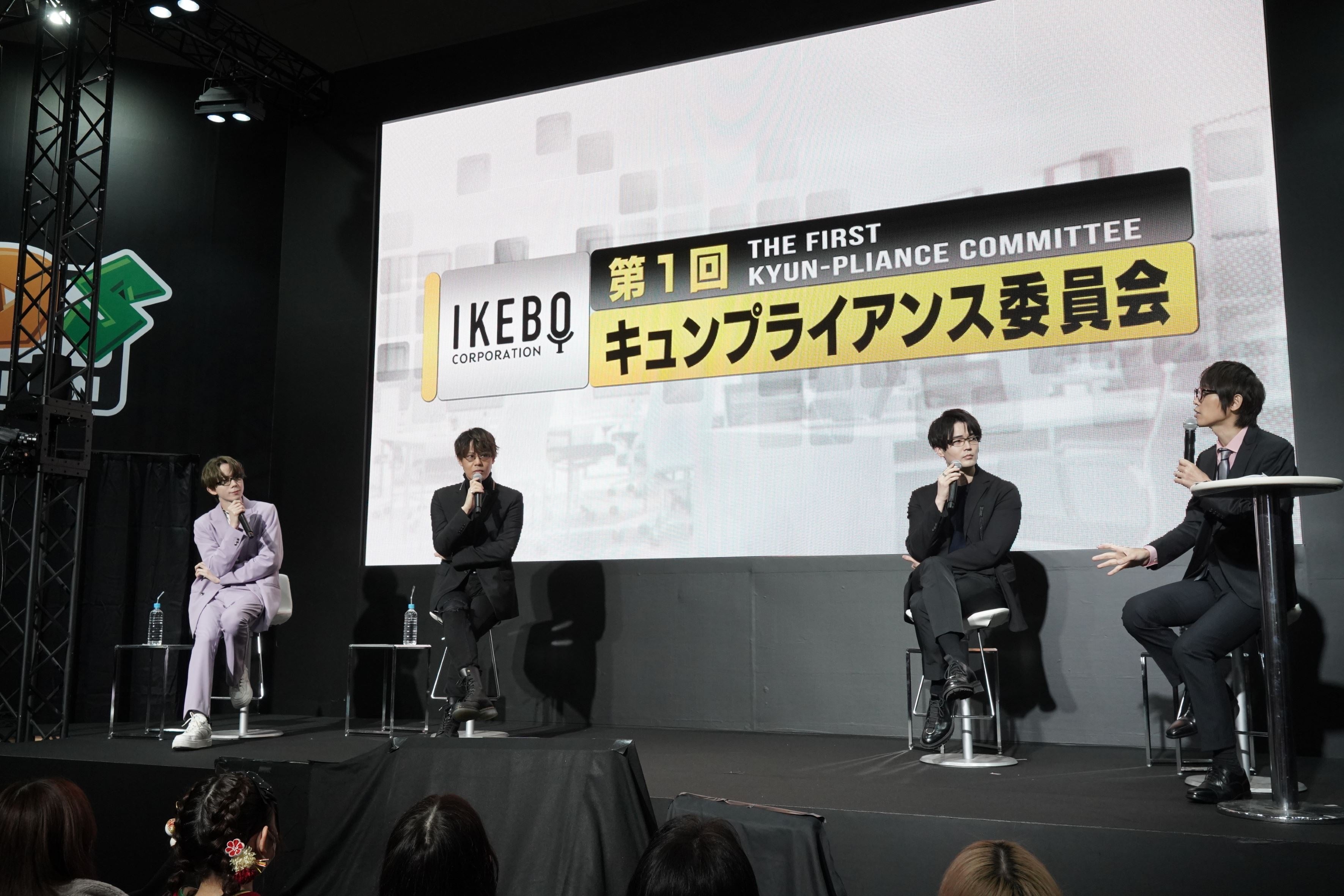 ステージイベントでは、メガネをかけスタイリッシュな恰好をした駒田航、神尾晋一郎、高塚智人、吉田尚記によるトークが行われました。本来はお客さんをキュンとさせることも目的だった「ようこそ妄想営業部へ♥」。しかし、最近は社員(キャスト)が変なエチュードを行うこともあり、是正しなければならない問題となりつつあるということで、「キュンプライアンス委員会」が発足されることとなりました。委員会では、過去に行われた3つのエチュードの映像を見ながら「キュンとしたかどうか」を駆け付けたお客さんがジャッジ。しかしながら、結果はすべて「キュンとしない」で、駒田・神尾・高塚の3人はその場で何が正しい“キュンエチュード”だったのか、戸惑いながらも実践することとなりました。