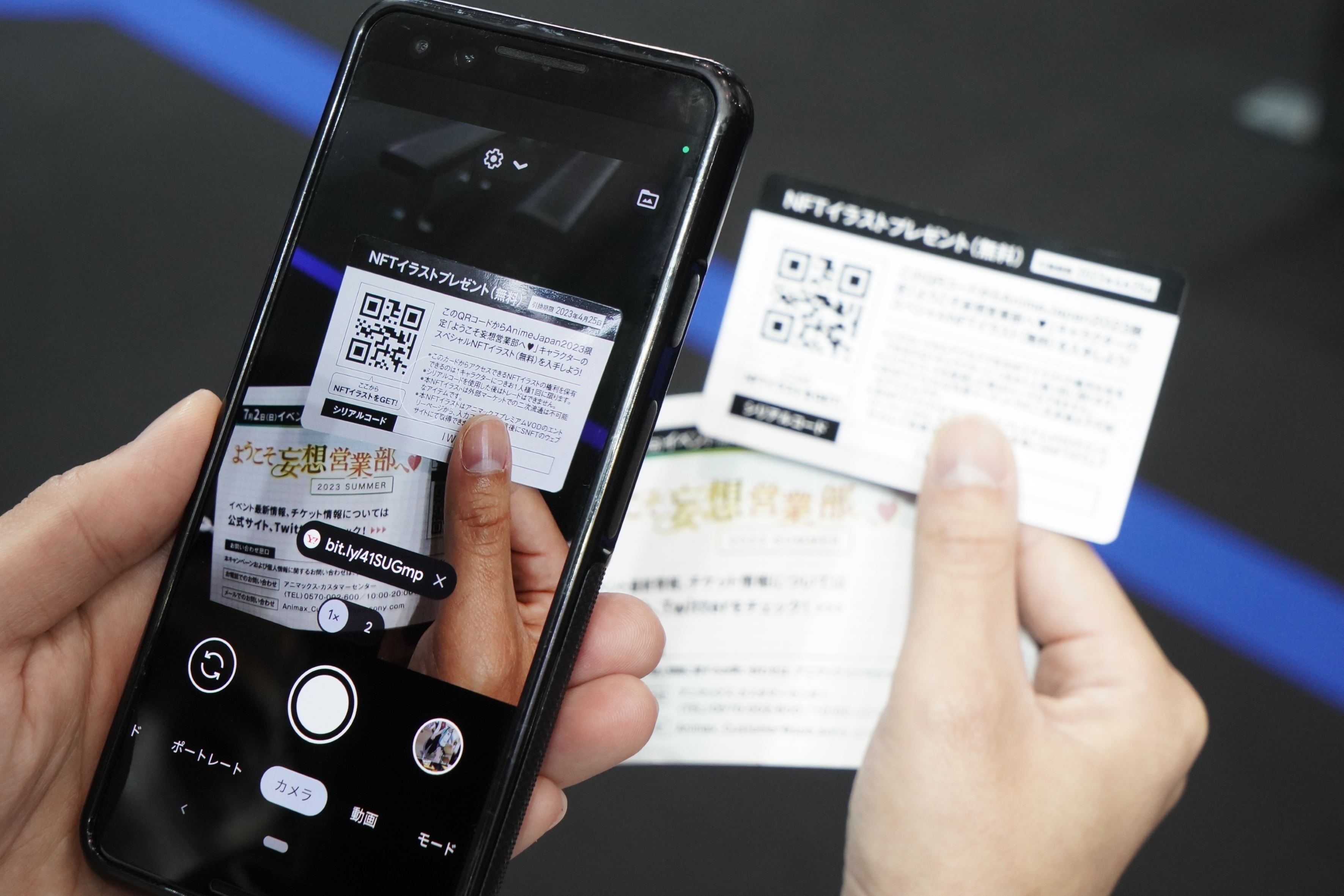 「ようこそ妄想営業部へ♥」のコーナーでは“配属ガチャ”を実施。ガチャでは、これまで本コンテンツに登場した全6部署総勢17キャラクターの社員証をモチーフにしたトレーディングカードが手に入ります。また、カード裏のQRコードを読み取ると、描き下ろしのNFTデジタルイラストも入手可能。ブロックチェーン技術で”あなたのもの”と証明された唯一無二の妄営♥NFTイラストは、AnimeJapan2023の会場でしか手に入らないレアものです!