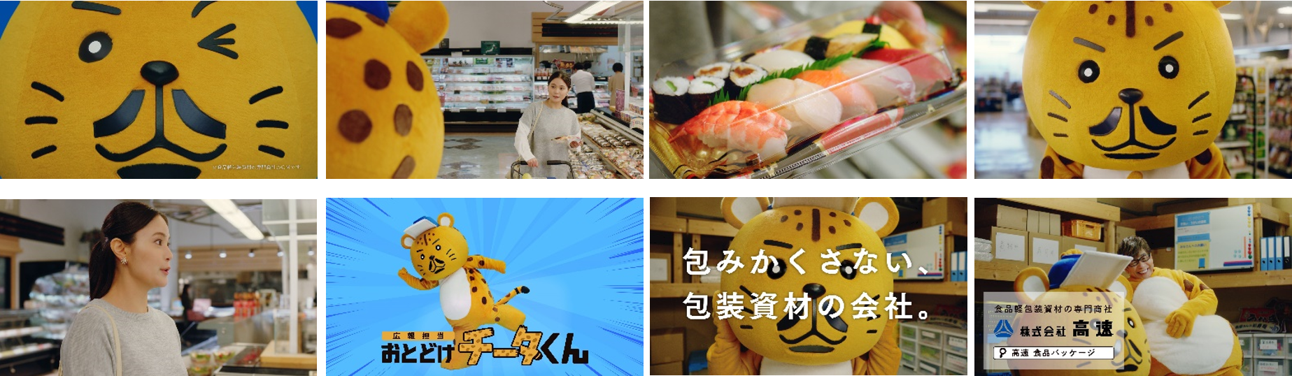 株式会社高速は、トレーやフィルムなどのパッケージをはじめ、商品企画の提案からお届けまでの全てのお手伝いをする、食品軽包装資材卸売り業界のリーディングカンパニーです。今回のTVCMに合わせ、会社の取扱商品であるトレーとどんぶり容器でできた帽子を被った高速の新キャラクター「おとどけチータくん」を制作しました。