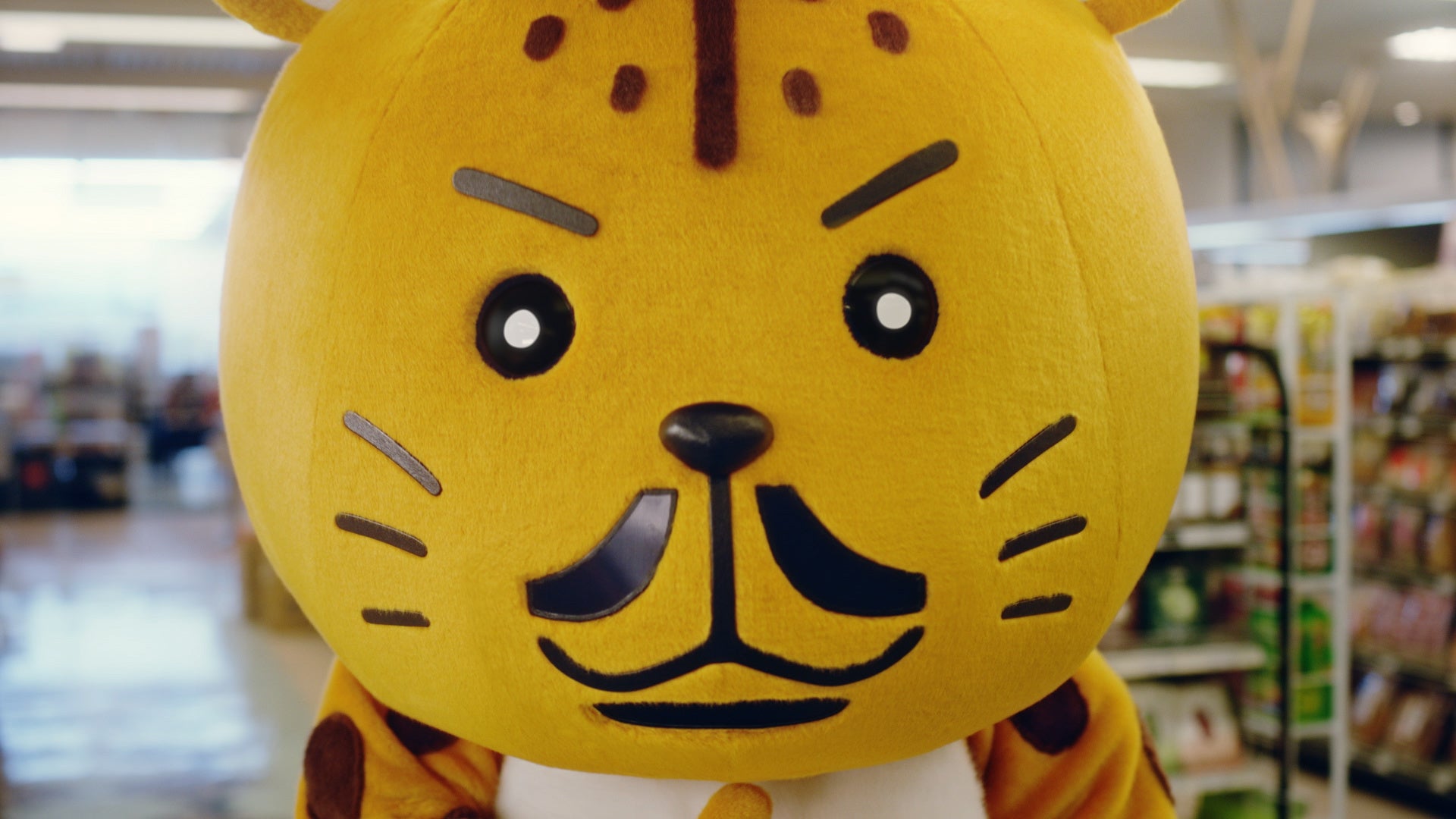 『おとどけチータくん』の着ぐるみ姿の山寺さんがスーパーで買い物中の女性に高速で会社紹介!