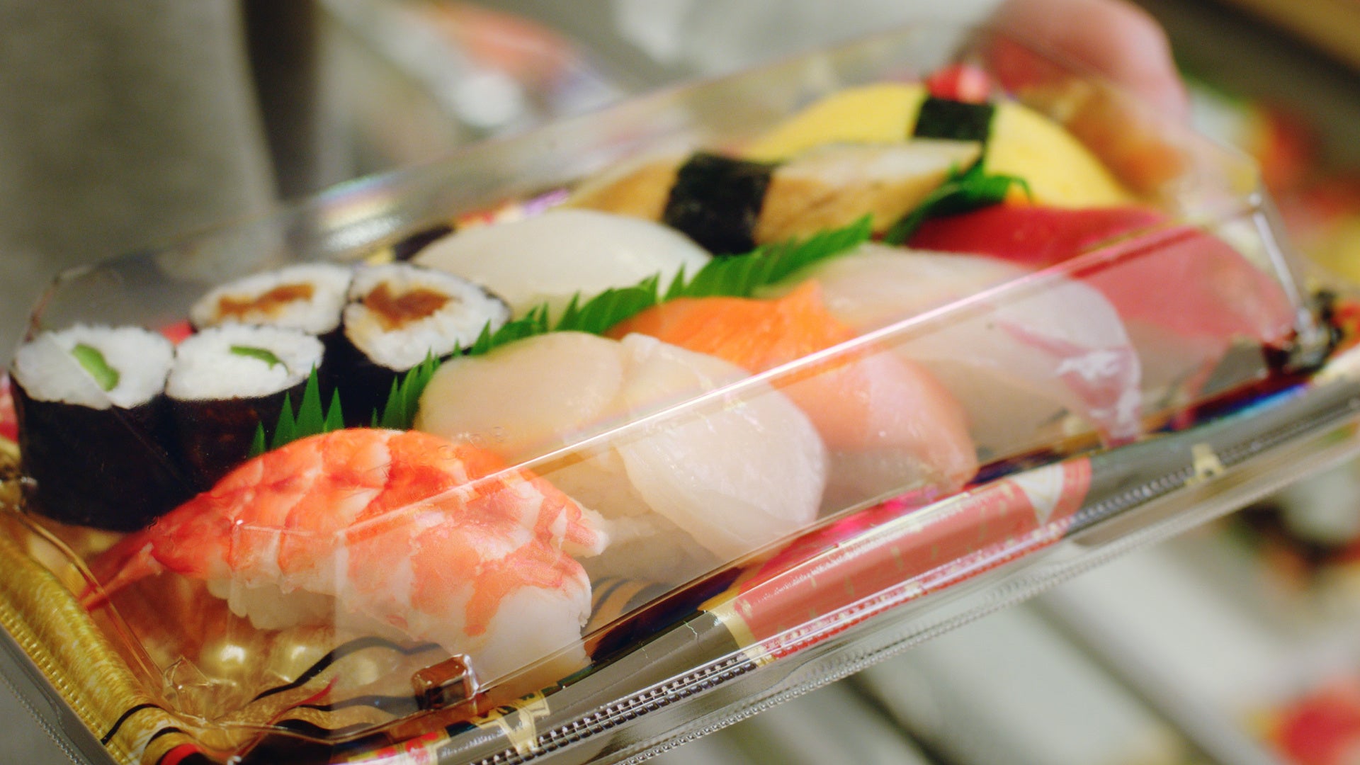 スーパーでお寿司のパックを手に取った女性が「美味しそう!」と呟くと、そこに「突然失礼します!」と言いながら『おとどけチータくん』が登場。「お寿司を美味しく見せるその容器、僕が用意しました!」と突如説明を始めます。女性が「え?」と反応したのも束の間、『おとどけチータくん』は自己紹介をしながら、「高速は、トレーやフィルムなどのパッケージをはじめ、商品企画、買い物かごやラベルシールのデザイン、そのお届けまでも全てをお手伝いする、食品包装のエキスパート!」と早口で説明。女性が「なんて高速喋り…」と驚いていると、「では!」と『おとどけチータくん』は高速で去っていきます。