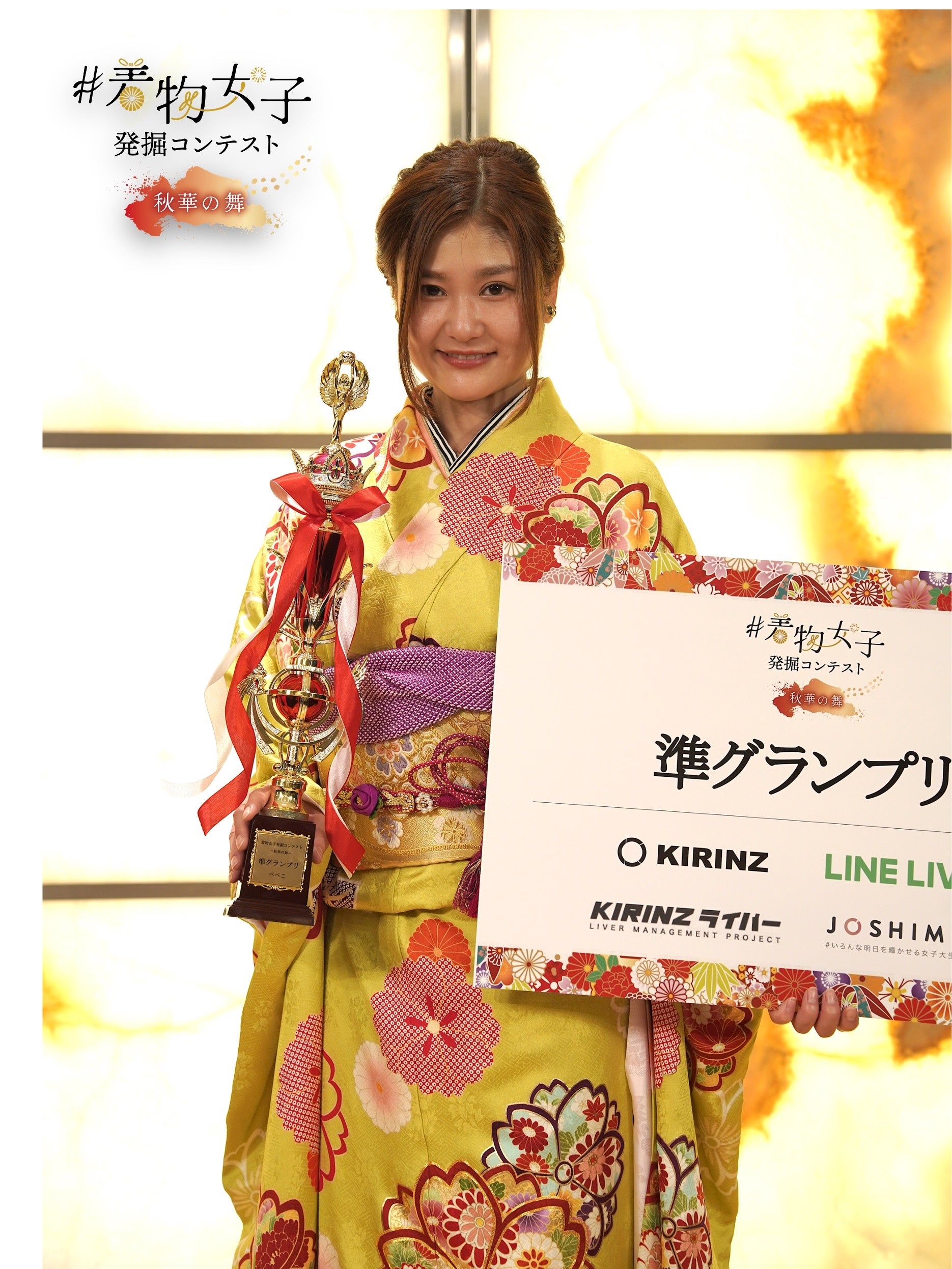 大人になってから新しい世界に挑戦し経験して学んだこと、沢山の方々と協力して掴み取れた準グランプリは私の誇りであり一生の宝物です。今後も自分の芯を貫き通し、素敵な着物女子に少しずつ近づいて行けるようファ