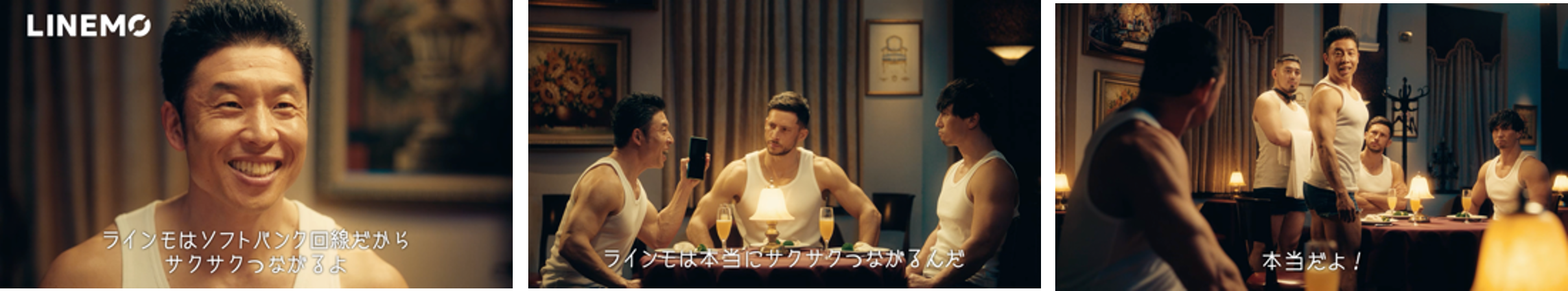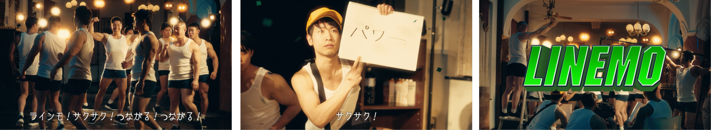 CMの舞台は 「パワー」と「ヤー」しか話さない世界にあるレストラン。そこへ訪れていたなかやまきんに君はレストランに集うマッチョたちにLINEMOの魅力を伝えていきます。中には、きんに君の言葉を信じようとしない人もいましたが、ひたむきにLINEMOの良さを訴え続けるきんに君。最終的にはその場にいた全員と心が通じ合い、LINEMOの良いところを知ってもらうことに成功。「LINEMOが俺たちをつなげてくれたよ!」と、その場にいた全員は一致団結し、LINEMOコールを掛け合います。音楽に合わせステージで祝いの舞を披露していると、なんと撮影していたカメラマンや照明スタッフもマッチョの面々ということが明らかに。「筋肉」と「パワー」と「ヤー」のみで彩られた世界をぜひご堪能ください。