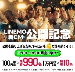■概要: LINEMO公式Twitterアカウント(@LINEMO_official)をフォローし、キャンペーンツイートのカンバセーショナルボタンを押してツイートすると抽選でデジタルギフトカードをプレゼント。