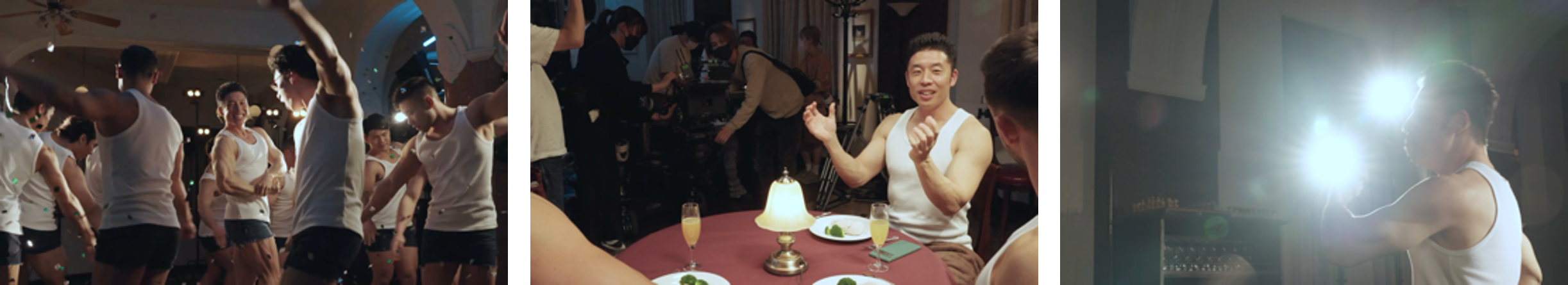 今回は、「パワー」と「ヤー!」で気合を溜めたなかやまきんに君が、お馴染みのタンクトップとホットパンツの姿で登場。たくさんのマッチョの中心となって、様々なシーンの撮影に挑みました。撮影シーンでは、「パワー」と「ヤー」を駆使してさまざまな表現に真剣に取り組んでいるきんに君の姿が。撮影の合間には、マッチョの方々と「どうやって腕を鍛えているのか」「どこのジムに行っているのか」などの筋トレトークで盛り上がり、終始和やかな雰囲気の現場となりました。撮影の最後には、スタッフから花束を受け取ったきんに君。フィナーレを迎え、スタジオ内にマッチョたちの大きな拍手の音が響き渡ると、その表情には満面の笑みがこぼれていました。