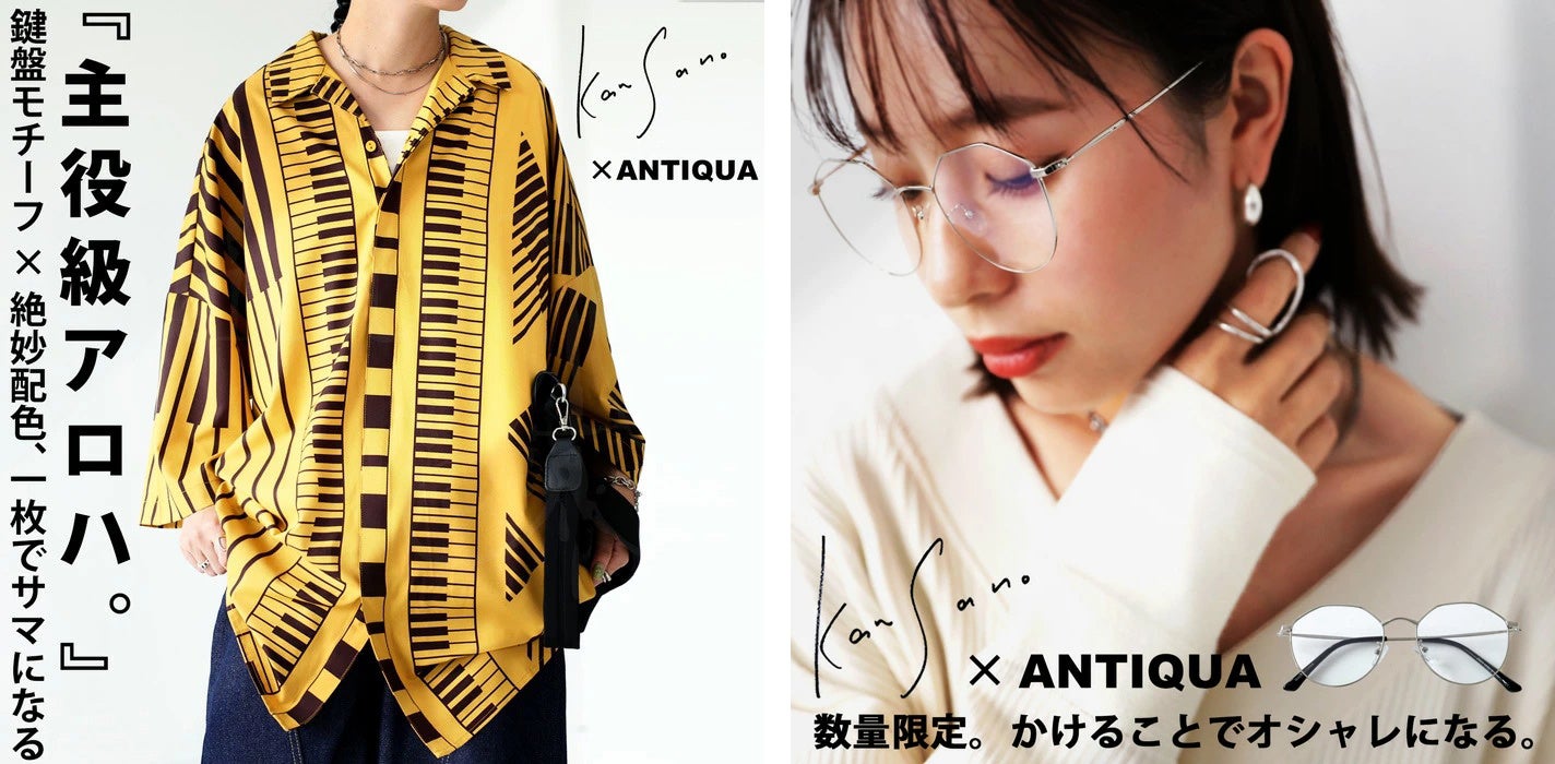 そんな Kan Sano氏とはこれまで「ANTIQUA TREE CAFE」にて何度かライブを行っていただいたり、ピアノ弾きのアロハシャツ、ホントノコトが見える眼鏡といったコラボ商品も展開するなど様々なコラボを行わせていただいておりますが、今回はKan Sano氏とのコラボで初となる、antiqua LOOK BOOKのモデルを務めていただきました。