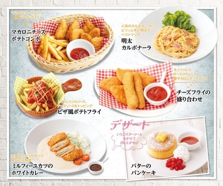 ピザ風ポテトフライ、チーズフライの盛り合わせ、マカロニチーズポテトコンボ、