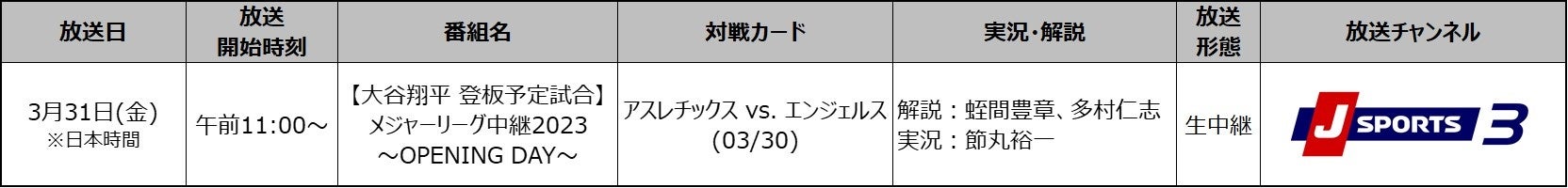スポーツテレビ局、株式会社ジェイ・スポーツ(本社 東京都江東区、代表取締役社長 長谷一郎、以下「J SPORTS」 ※1)は、日本時間3月31日(金)に開幕する「メジャーリーグベースボール(MLB)2023」ロサンゼルス・エンジェルス大谷翔平選手の先発出場試合を全試合放送いたします。また、ダルビッシュ有選手(サンディエゴ・パドレス)をはじめ、日本人注目選手の先発出場試合も連日放送いたします。