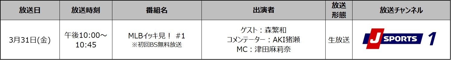 そして、開幕日の3月31日(金)からは、MLBの魅力を発信するMLB情報番組「MLBイッキ見!」を毎週金曜日の午後10時より初回BS無料放送でお届けいたします。