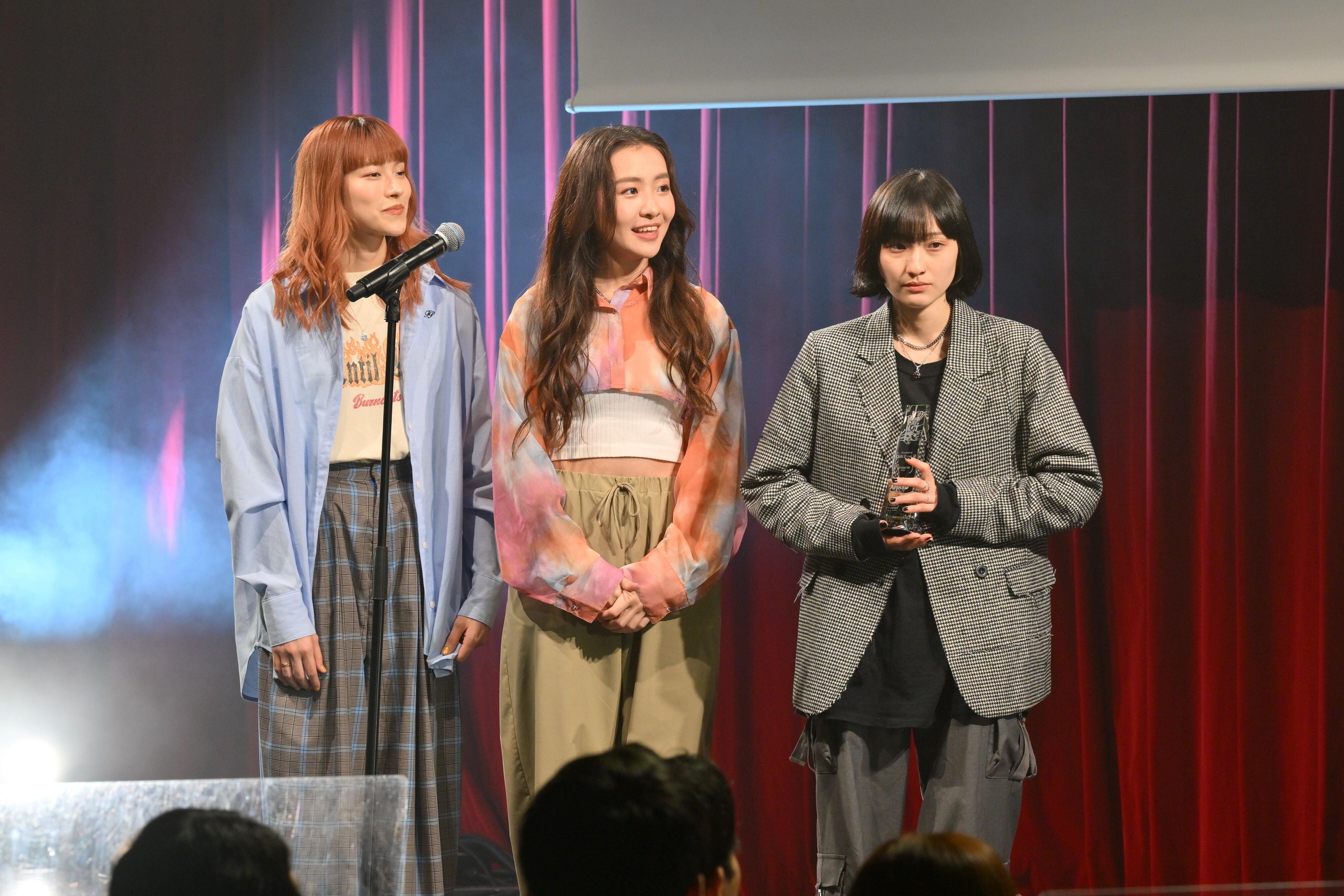 続いては、J-WAVE「SONAR TRAX」に選ばれたアーティストの中から、2023年さらなる活躍が期待される注目のニューアーティストが受賞する「BEST SONAR TRAX OF 2022」の発表へ。プレゼンターとしてJ-WAVE『ENEOS FOR OUR EARTH -ONE BY ONE-』のナビゲーターを務める堀田茜が登壇。彼女の口から7月のSONAR TRAXに選出された楽曲「School」が2週連続で最高位2位を記録したChilli Beans.が受賞者だと発表された。堀田の呼び込みで壇上にやってきたChilli Beans.は「本当に本当にうれしく光栄に思います。これもひとえにいつも応援してくださっているみなさん、チームのみんなとか、みんなの力あっての受賞だと思っています。これからも自分たちらしく音楽を続けていけたらと思っているので、引き続き応援よろしくお願いします」と受賞を噛みしめた。またプレゼンターの堀田から3人でうまくやっていく秘訣を尋ねられると、Lily(Gt&Vo)が「3人で相談をたくさんする。ちゃんと話し合うこと」と、その秘訣を明かした。